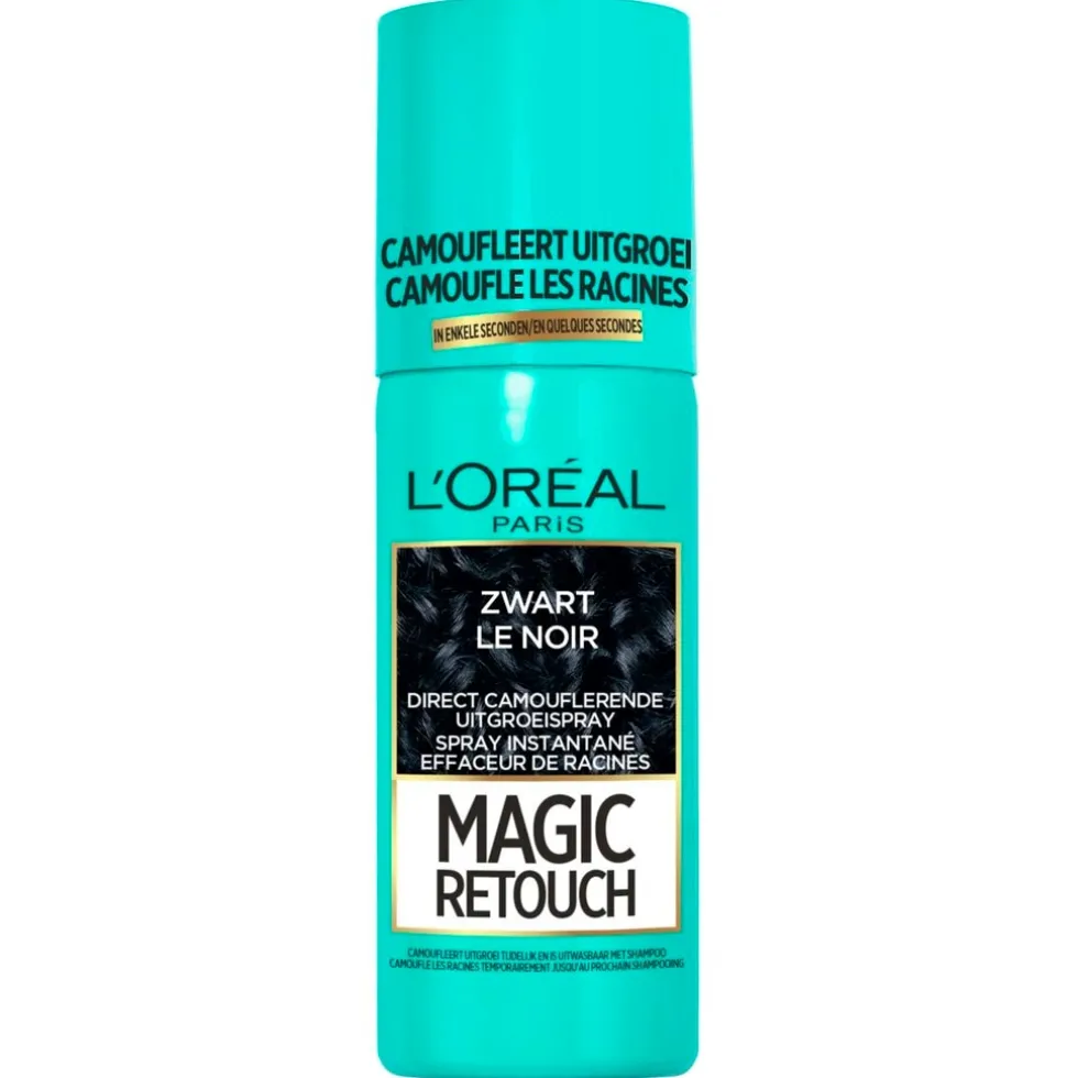 L’Oréal Paris Magic Retouch Zwart Camouflerende Uitgroeispray is een uitwasbare spray die je uitgroei in drie seconden laat verdwijnen. De uitgroeispray camoufleert uitgroei tot de eerstvolgende wasbeurt met shampoo.