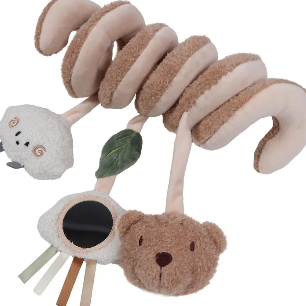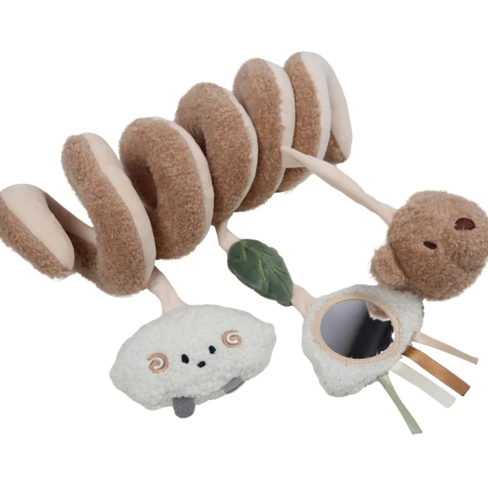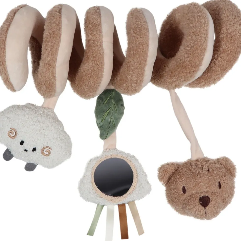 Aan de spiraal hangen drie lieve speeltjes: een vrolijk wolkje, een zacht teddy schaapje en natuurlijk Bowie de Beer zelf. Ieder speeltje biedt iets unieks: een veilig spiegeltje, een squeeze geluidje en verschillende stoffen die de zintuigen van je kindje prikkelen. Leuk om naar te kijken, nog leuker om te ontdekken!