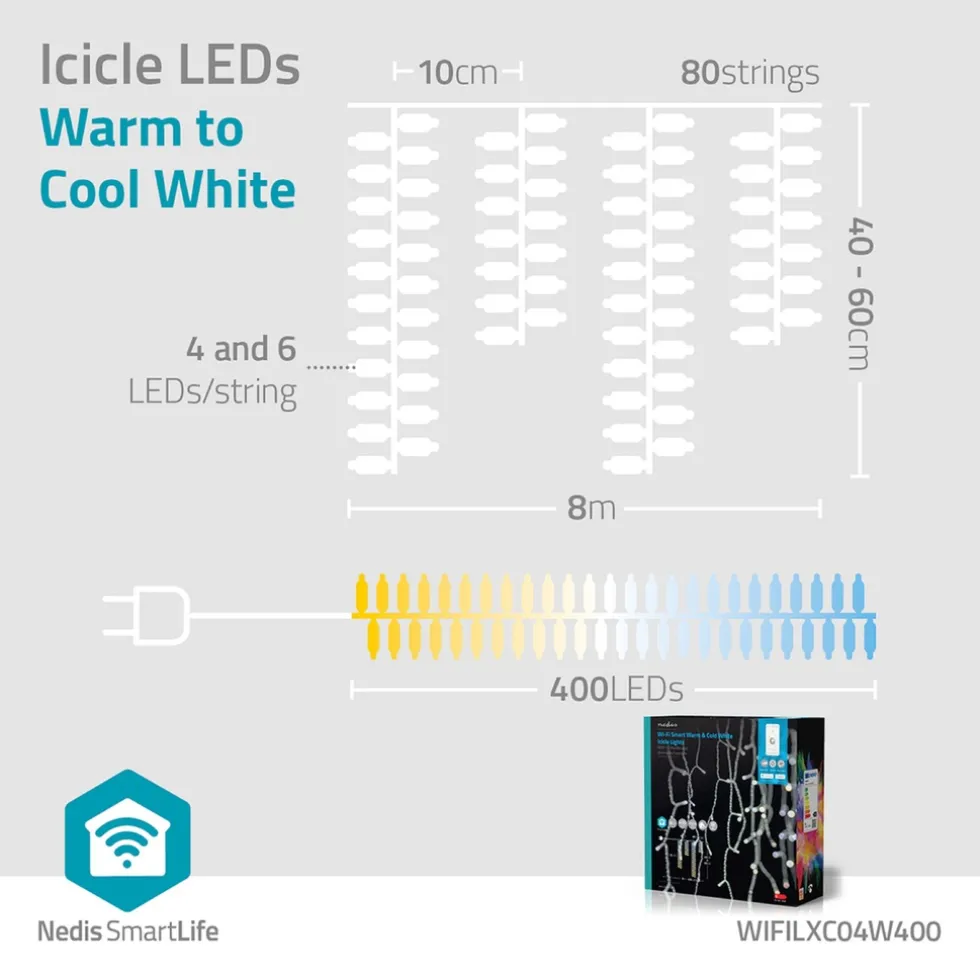 Dit gebruiksvriendelijke Smart Wi-Fi-ijspegelsnoer van Nedis heeft 80 pegels met 400 warm- tot koelwitte LED’s met het patroon 4-6. Deze ijspegelverlichting heeft een breedte van 8 meter en een lengte van 40/60 centimeter. Het is ideaal voor muur-, dak- en raamdecoratie. Door de geavanceerde slimme technologie tilt het jouw decoratie naar een hoger niveau. Naast het regelen van de gewenste helderheid kun je ook een van de 11 vooraf gedefinieerde effecten met verschillende soorten bewegingspatronen of de stabiele modus kiezen. Voor nog meer comfort kun je timers en routines instellen, zodat jouw lichtsnoer altijd op het juiste moment brandt. Met spraakbediening via Amazon Alexa of Google Assistant kun je de lichten ook in- of uitschakelen, dimmen of de helderheid ervan selecteren met alleen maar een spraakopdracht. Met de geïntegreerde microfoonfunctie kunnen de lichten reageren op jouw muziek of andere geluiden.De transparante kleur van de kabel past netjes bij elke achtergrond en verstoort het optische beeld niet. Dit 3 meter lange netsnoer laat niets te wensen over. Erg praktisch als je stopcontact iets verder weg is. De boom kan buiten worden gebruikt.Eenvoudig in te stellenHet Smart Wi-Fi-lichtsnoer kan zonder gateway worden geïnstalleerd en rechtstreeks in je draadloze netwerk worden geïntegreerd. Dit vereenvoudigt de installatie en bespaart bijkomende kosten. Je kunt de lichten bedienen met de gratis Nedis SmartLife-app om automatiseringen in te stellen op basis van tijdsplanning, zonsondergang of in combinatie met andere Nedis SmartLife-producten. In combinatie met Google Home of Amazon Alexa kun je zelfs gesproken commando’s geven om de patronen van de ijspegelverlichting te veranderen.