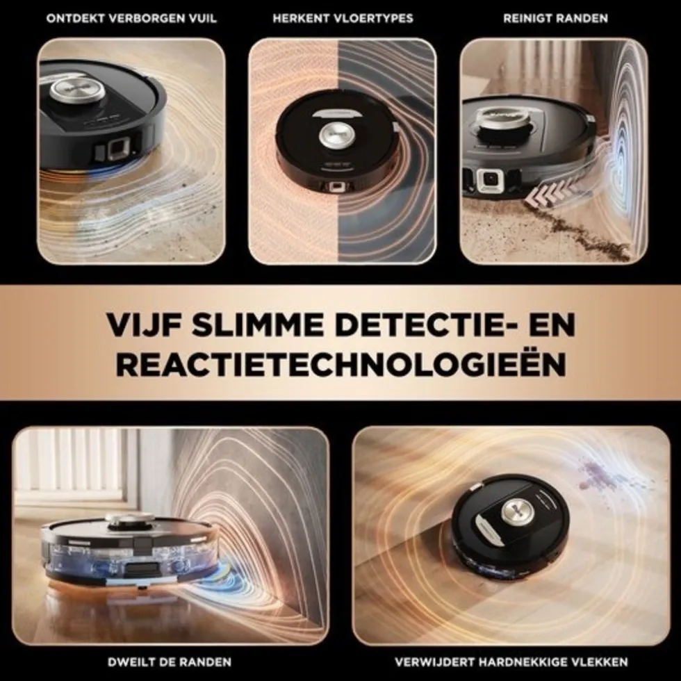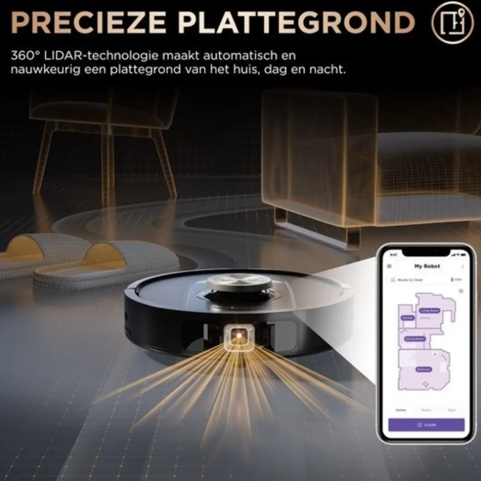 De 360° LiDAR-technologie maakt snel en nauwkeurig een kaart van elk hoekje van de woning, zodat grondig kan worden schoongemaakt. Objecten in het pad worden herkend, zowel dag als nacht, en er wordt ingespeeld op dagelijkse veranderingen in de omgeving.