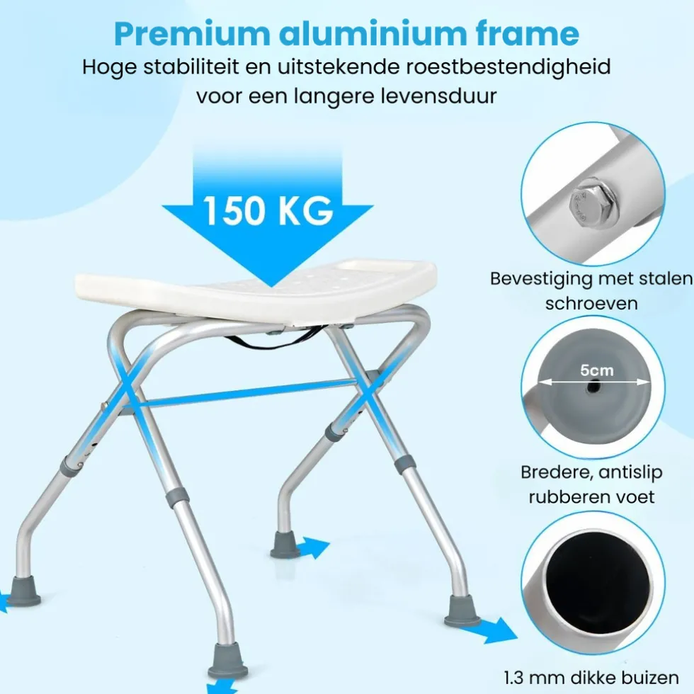 Zeker, dankzij het aluminium frame, rubberen voetjes én handgrepen heb je optimale grip en steun. - Kan ik deze douchestoel meenemen of opbergen?
