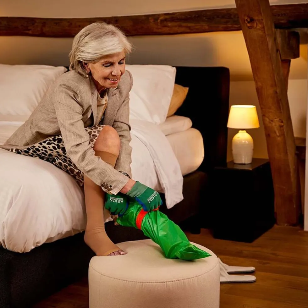 Arion Easy-Off is een uittrekhulpmiddel voor compressiekousen en panty’s, ontworpen voor een soepele, wrijvingsvrije ervaring. Geschikt voor mensen die hun tenen kunnen bereiken én voor verzorgenden die hulp bieden bij het uittrekken.