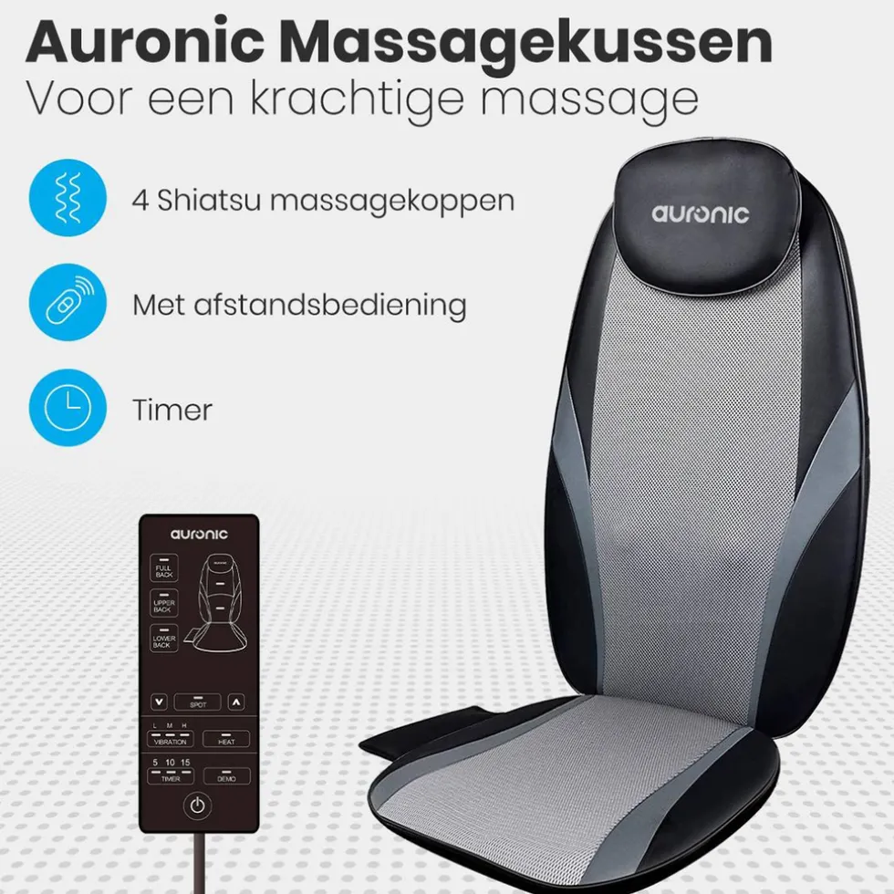 Veelzijdig in gebruik Het Auronic massagekussen kan voor zowel je boven- en onderrug, je zitvlak, je heupen en je benen gebruikt worden. Door het model kan het massagekussen gemakkelijk op zitvlakken zoals een bank, fauteuil, kantoorstoel of gewone stoel gebruikt worden. Daarnaast heeft het massagekussen een geïntegreerd gordelsysteem zodat je hem op je stoel kan bevestigen. Zo blijft het massagekussen goed zitten en kan jij lekker ontspannen.