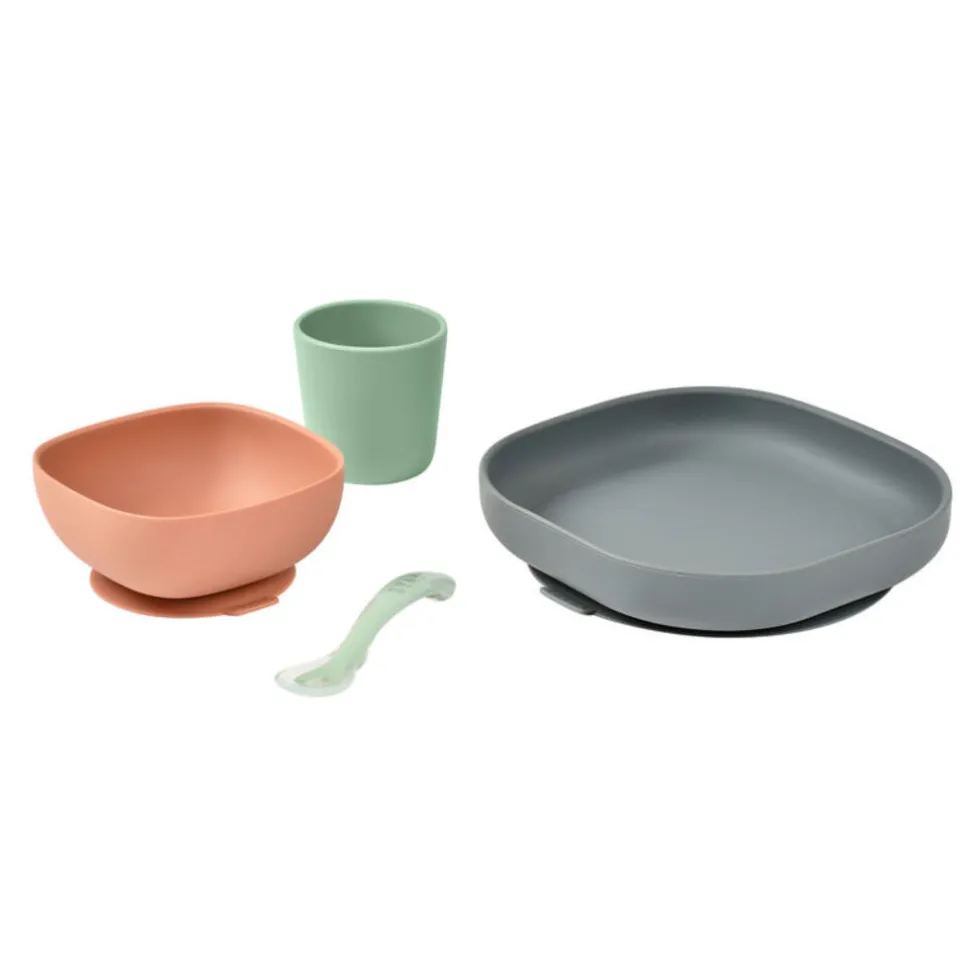 De Beaba Siliconen Maaltijdkoffer 4 Stuks wordt geleverd met een bord, kom, lepel en een beker. Het bord, de kom en de beker zijn voorzien van een zuignap aan de onderkant. Dit zorgt voor stabiliteit op de tafel en voorkomt onbedoeld morsen en gooien van eten en drinken door je baby.
