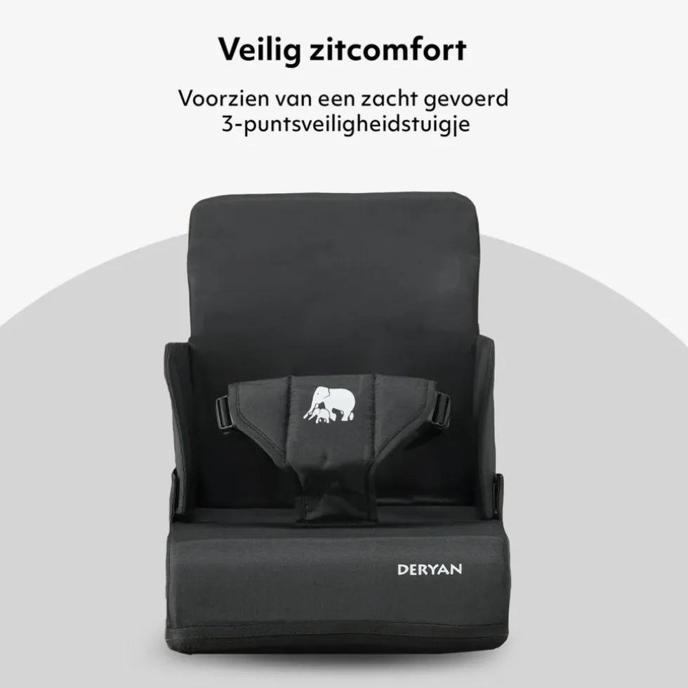 De Deryan Travel Booster zorgt ervoor dat je kindje overal veilig en comfortabel aan tafel kan zitten. Deze slimme stoelverhoger is compact, lichtgewicht en eenvoudig te bevestigen aan vrijwel iedere standaard eetkamerstoel. Perfect voor thuis, op vakantie of bij opa en oma.