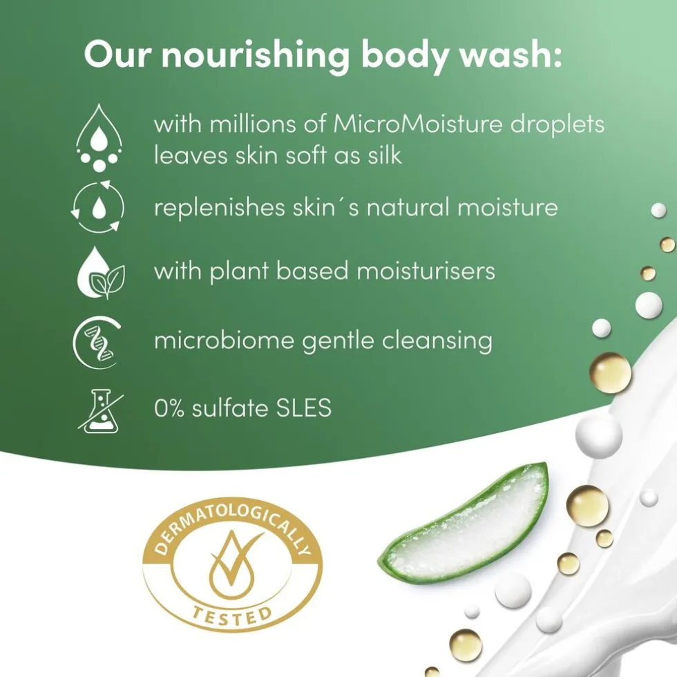 Het lichte en bruisende schuim is doordrenkt met de geur van aloë vera en berkenwater, waardoor het een stimulerende en heerlijk verfrissende douchecrème is die je droge huid hydrateert om je dag goed te beginnen. Deze sulfaatvrije douchecrème biedt de verzorging die je droge huid nodig heeft, met 93% zichtbare huidverbetering na slechts één douchebeurt. De 24 uur vernieuwende micro moisture zorgt voor langdurige hydratatie en diepe voeding.
