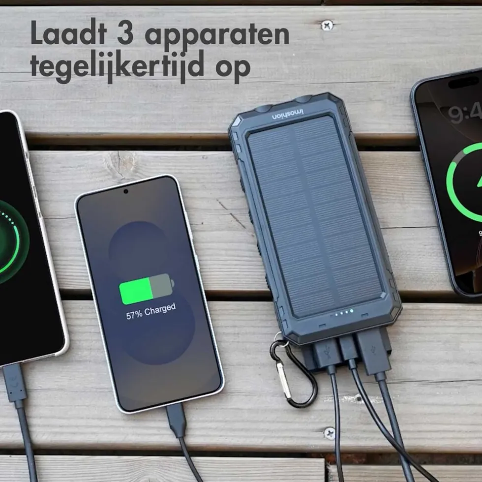 Houd jij van survivallen en ben je vaak in de buitenlucht te vinden? Met deze imoshion Solar Powerbank heb je altijd en overal een opgeladen telefoon of tablet bij je. De powerbank wordt geleverd met een USB-C naar USB-C kabel. Deze kabel beschikt over Power Delivery technologie, zodat je toestel razendsnel opgeladen is. De laadcapaciteit van 10.000 mAh zorgt ervoor dat je je toestel ongeveer 2 keer kunt opladen.Opladen en bijladenLaad de imoshion Solar Powerbank volledig op door middel van de meegeleverde USB-C kabel. Een handige extra is het ingebouwde zonnepaneel. Is de powerbank (bijna) leeg maar bevind je je in een noodsituatie? Wanneer er geen stopcontact in de buurt is, laad je dankzij het zonnepaneel de powerbank een paar procent extra op. Houd er rekening mee dat het opladen via de zon langzaam gaat, omdat de powerbank een grote batterijcapaciteit heeft. Daarnaast moet de zonkracht hoog zijn.Razendsnel opladen dankzij meegeleverde kabelDeze powerbank wordt geleverd met een USB-C naar USB-C kabel. Deze kabel ondersteunt Power Delivery technologie, zodat jij je telefoon of tablet razendsnel oplaadt. De gemiddelde smartphone is in slechts 30 minuten maar liefst 50% opgeladen. De universele USB poort ondersteunt Quick Charge technologie.Meerdere apparaten tegelijkertijd opladenDe imoshion Solar Powerbank beschikt over 3 output poorten, waarvan 2 universele USB-A poorten zijn en 1 USB-C poort. Hiermee laad je 3 verschillende apparaten tegelijkertijd op.Perfect voor outdoorDeze powerbank is ideaal voor mensen die veel buiten zijn. De powerbank is namelijk spatwaterdicht (IP45); een paar regendruppels zijn dus geen probleem. Ook beschikt de powerbank over een ingebouwd kompas en een zaklamp, zodat je nooit de weg kwijtraakt in het donker.Waarom de imoshion Solar Powerbank?