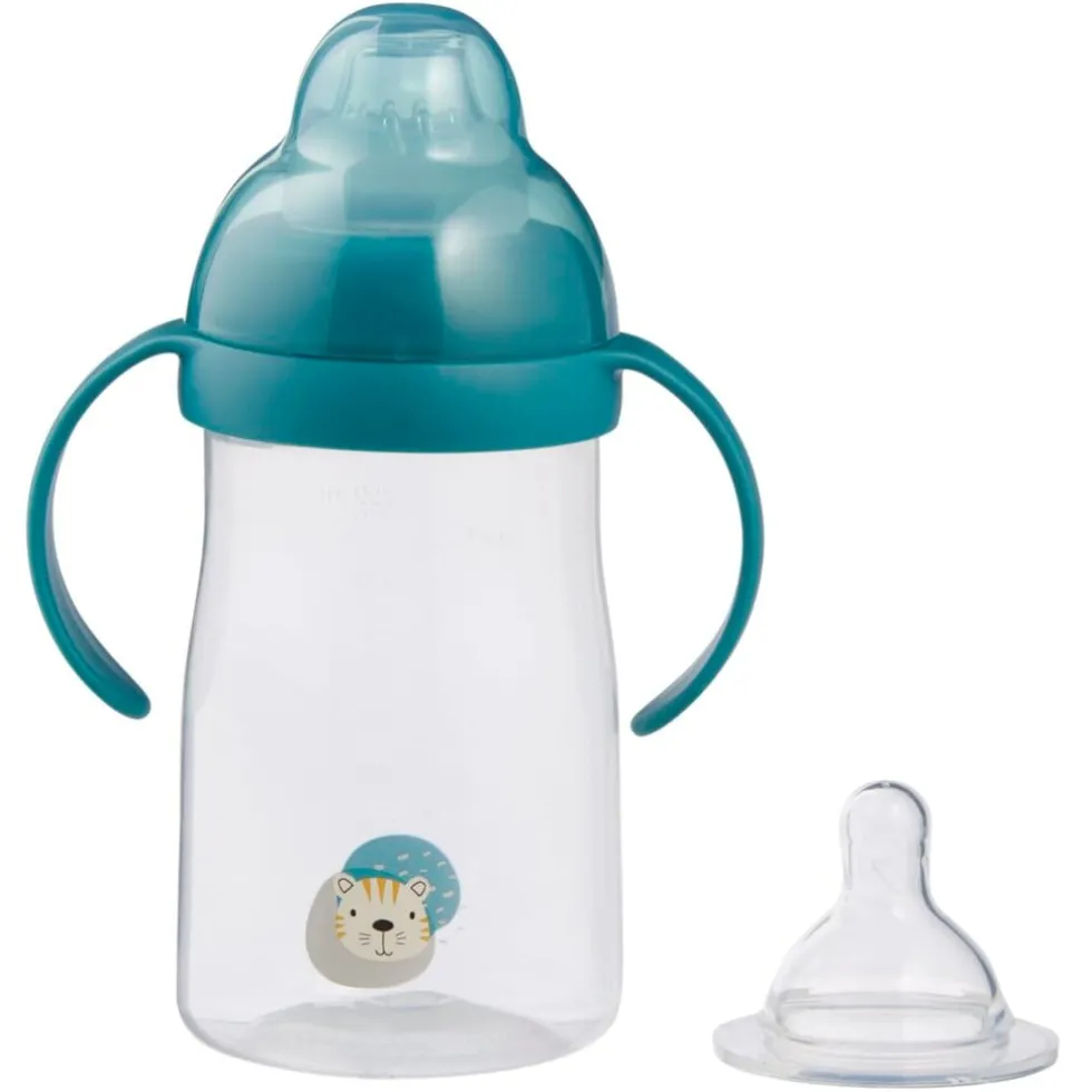 Later kun je de speen vervangen door een zachte tuit om de overgang naar een tuitbeker makkelijker te maken. De handvatten zijn verwijderbaar. Er zit een dop op de speen/ tuit tegen het lekken en voor de hygiëne.
