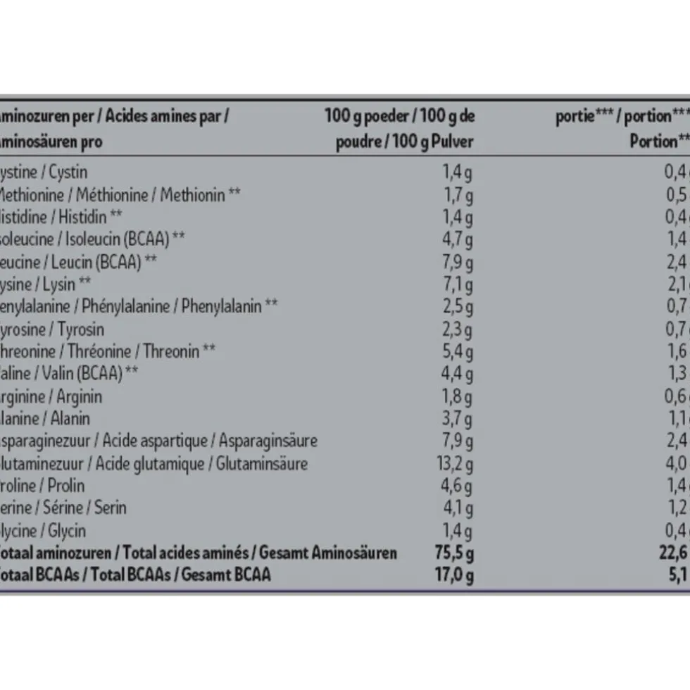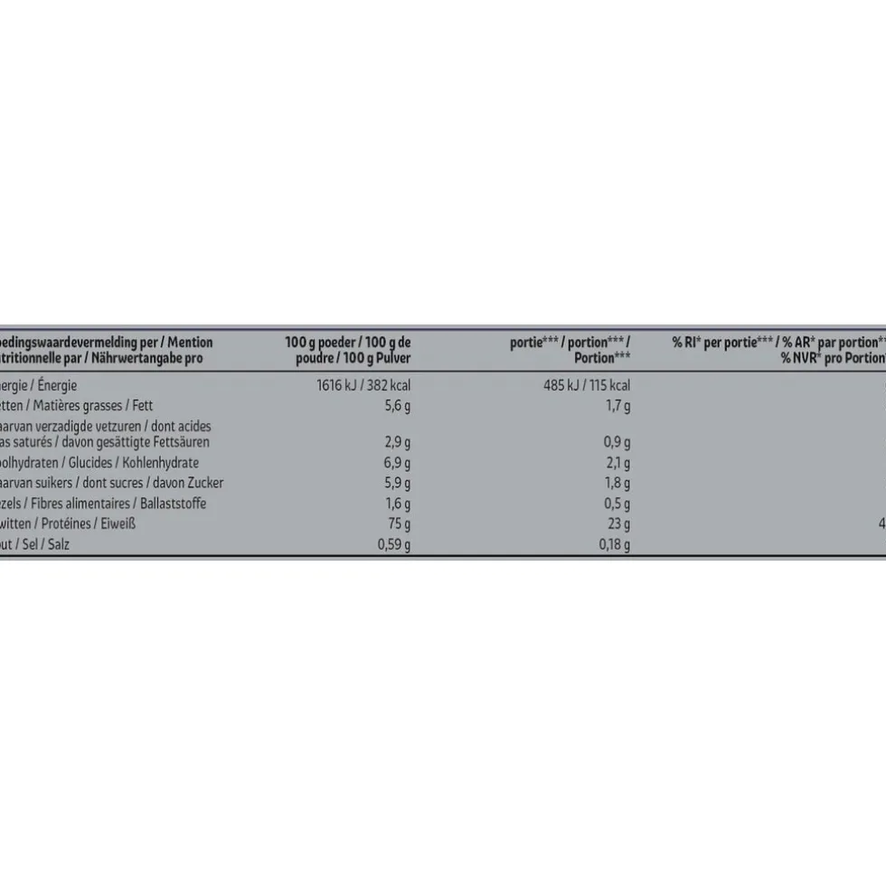 Samenstelling:# Voedingswaardevermelding per;100 g poeder; ; ;portie***; ; ;%RI*per portie***# Energie;1616 kJ /;382 kcal;485 kJ/;115 kcal;6%# Vetten;5,6;g;1,7;g;2%# waarvan verzadigde vetzuren;2,9;g;0,9;g;5%# Koolhydraten;6,9;g;2,1;g;1%# waarvan suikers;5,9;g;1,8;g;2%# Vezels;1,6;g;0,5;g;-# Eiwitten;75;g;23;g;45%# Zout;0,59;g;0,18;g;3%# * RI = Referentie-innamevan een gemiddelde volwassene(8400 kJ/2000 kcal).# *** Een portie is 30 g +250 ml water.# Aminozuren per;100 g poeder;; ;portie***; ; # Cystine;1,4;g;0,4;g# Methionine**;1,7;g;0,5;g# Histidine**;1,4;g;0,4;g# Isoleucine(BCAA)**;4,7;g;1,4;g# Leucine(BCAA)**;7,9;g;2,4;g# Lysine**;7,1;g;2,1;g# Fenylalanine**;2,5;g;0,7;g# Tyrosine;2,3;g;0,7;g# Threonine**;5,4;g;1,6;g# Valine (BCAA)**;4,4;g;1,3;g#Arginine;1,8;g;0,6;g# Alanine;3,7;g;1,1;g# Asparaginezuur;7,9;g;2,4;g# Glutaminezuur;13,2;g;4,0;g# Proline;4,6;g;1,4;g# Serine;4,1;g;1,2;g# Glycine;1,4;g;0,4;g# Totaal aminozuren;75,5;g;22,6;g# Totaal BCAAs;17,0;g;5,1;g
