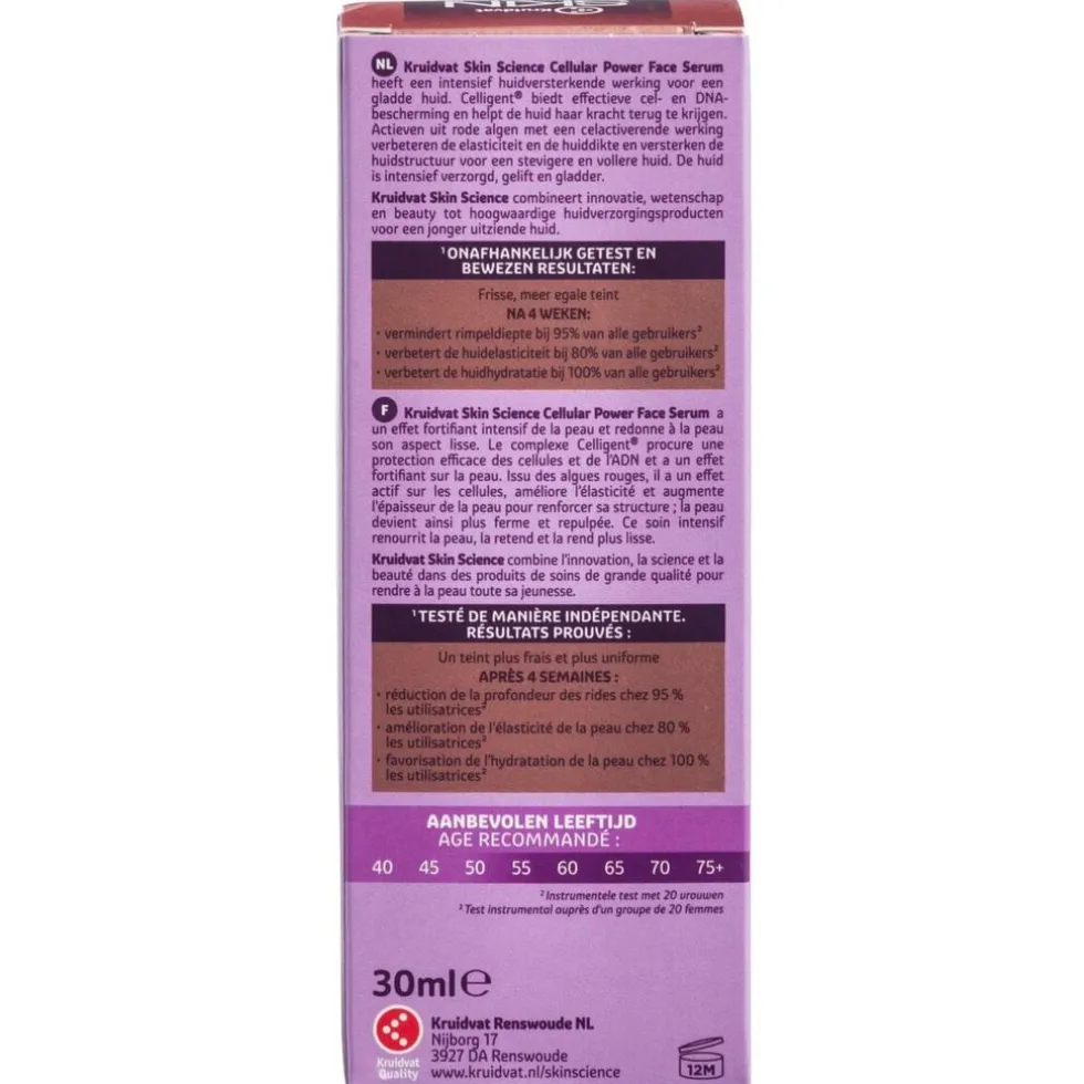 Kruidvat Skin Science Cellular Power 55+ Face Serum heeft een intensief huidversterkende werking voor een gladde huid. Het celligent in het serum biedt effectieve cel- en DNA-bescherming en helpt je huid haar kracht terug te krijgen.