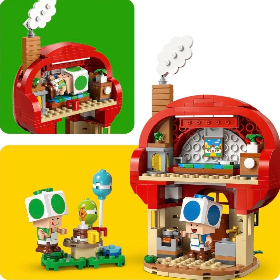 De set bevat een gedetailleerd Toad-huisje met een keuken en slaapkamer (met een schilderij van Peach’ kasteel aan de muur) en uitneembare meubels om er gemakkelijk mee te spelen. Buiten staat een picknicktafel met plek voor de blauwe en groene Toad, plus een bouwbare grammofoon en feestaccessoires. Deze Nintendo LEGO set bevat figuren van blauwe Toad en groene Toad.