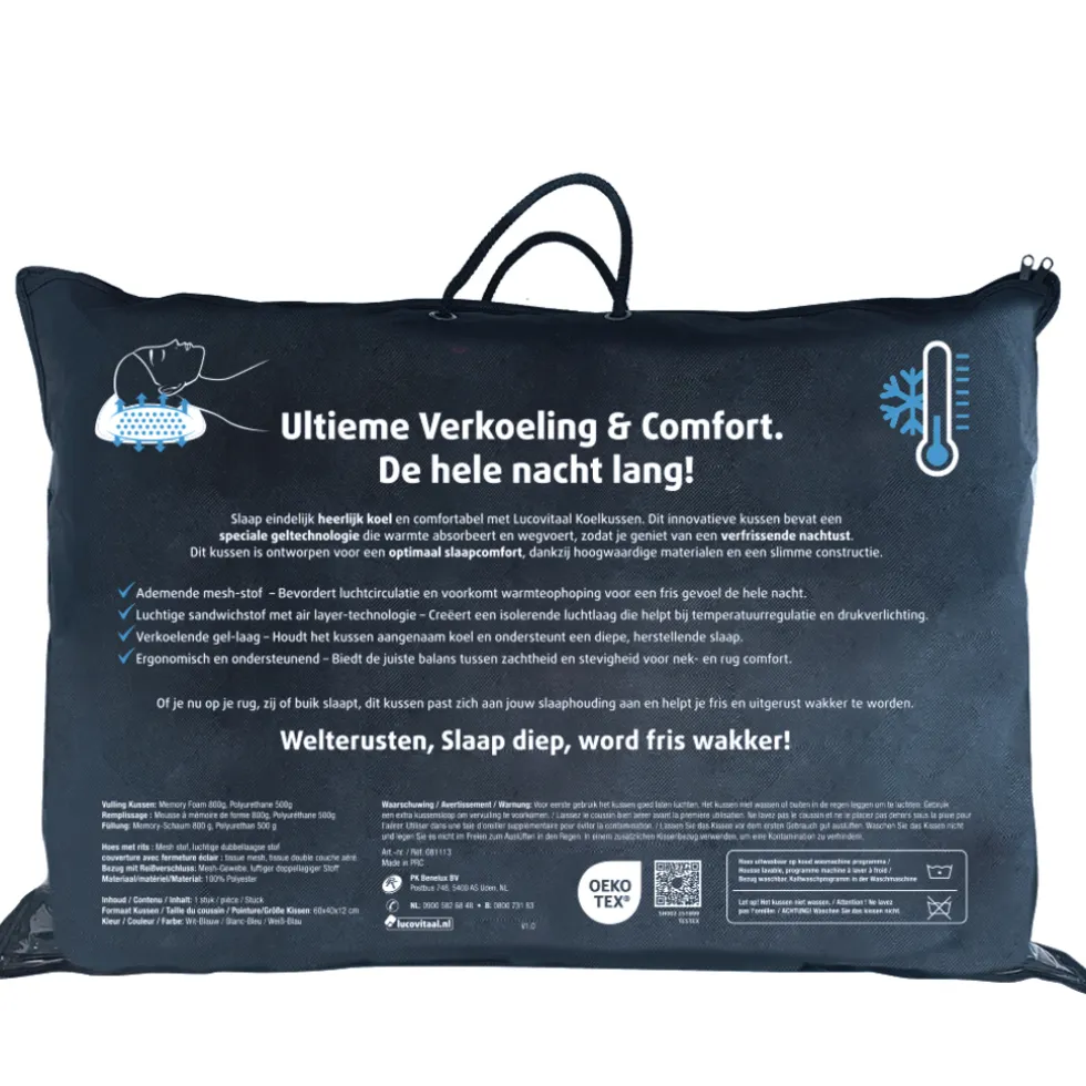 Slaap eindelijk heerlijk koel en comfortabel met Lucovitaal Koelkussen. Dit innovatieve kussen bevat een speciale geltechnologie die warmte absorbeert en wegvoert, zodat je geniet van een verfrissende nachtust.