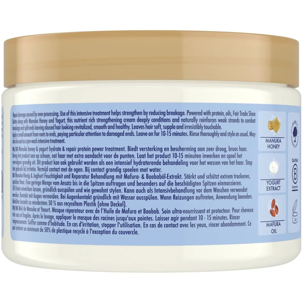 • Het haarmasker is verrijkt met manukahoning, yoghurt en fair trade sheaboter.