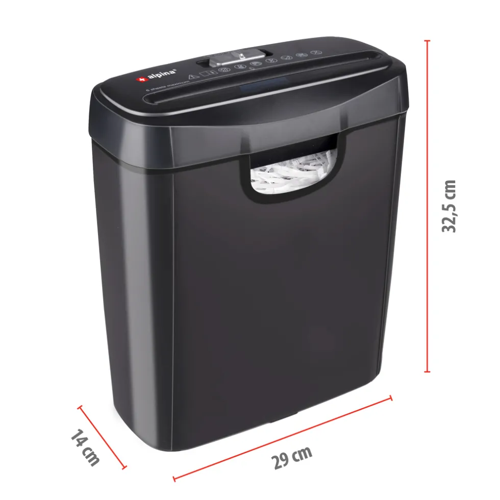Gebruik je de shredder regelmatig, dan zet je hem het beste in de stand ‘auto’. Als het versnipperen is voltooid, gaat de versnipperaar dan automatisch terug naar stand-by. De shredder kan vastlopen als je bijvoorbeeld meer dan 6 A4-tjes in het apparaat hebt gedaan. Met de standen ‘rev’ en ‘fwd’ kun je de richting van de messen aanpassen om het papier te verwijderen.Beschermd tegen oververhittingAls je veel papier vernietigt, wordt de versnipperaar binnenin heet. De ingebouwde bescherming tegen oververhitting schakelt het apparaat uit om schade te voorkomen. Laat de shredder na twee minuten gebruik minimaal veertig minuten afkoelen voordat je de papiervernietiger opnieuw gebruikt.Specificaties alpina Papierversnipperaar