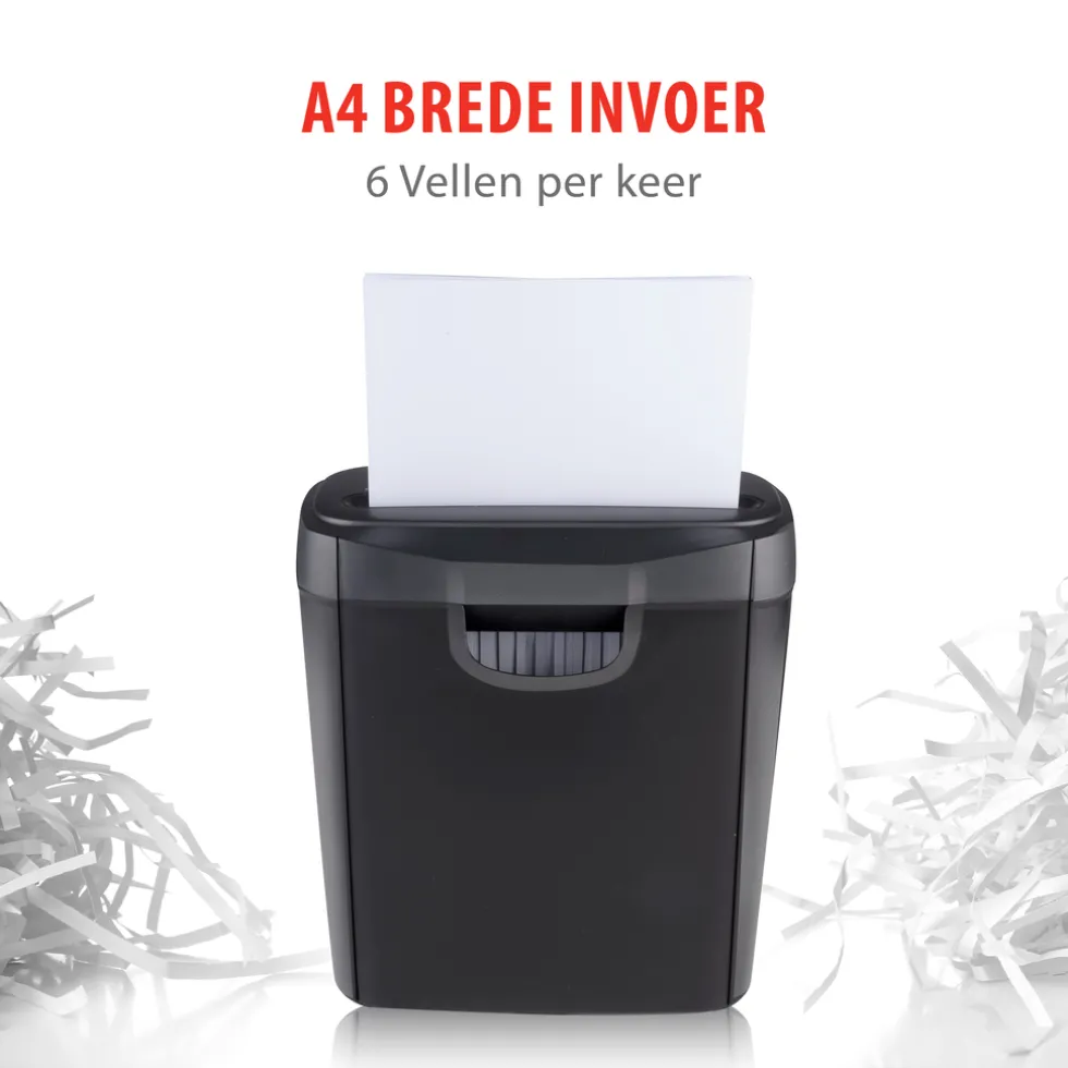 Versnipperaar voor papier: 6 A4 vellen per keerDe automatische shredder versnijdt je papier in stroken. De snijstrip snijdt per keer 6 vellen van 80 gram A4-formaat. De kleine papierstrookjes vangt hij op onder de messen, in een opvangbak van 10 liter.Gemakkelijk bedienenBedienen van de shredder gaat heel gemakkelijk. Bovenop de papierversnipperaar zit een bedieningsknop met 4 standen: