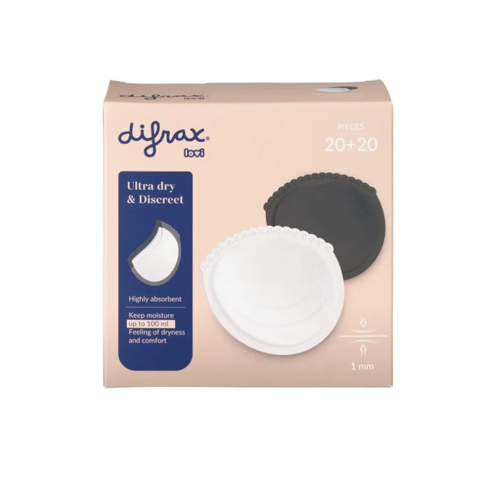 De Difrax Zoogkompressen zijn huidvriendelijk en bieden extra zekerheid voor dag én nacht. De kompressen hebben een ruime pasvorm en zijn uiterst discreet. Om naar behoefte van verschillende huidtypes te voorkomen dat de zoogkompressen doorschijnen in bepaalde kledingstukken vind je in de verpakking twee kleuren. Er zitten twintig witte en twintig zwarte zoogkompressen in de verpakking. Ze zijn hygiënisch en per stuk verpakt.