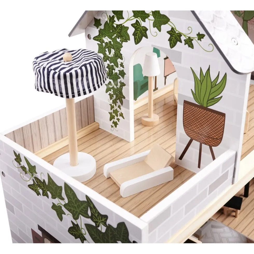 De muren van het huis hebben mooie schilderingen die passen bij de verschillende kamers. De kwaliteit en precisie van de afwerking zullen zowel volwassenen als kinderen verrukken. Alle elementen van het huis zijn zorgvuldig geschuurd zodat het kindgeen splinters niet in de handenkrijgt tijdens het spelen.