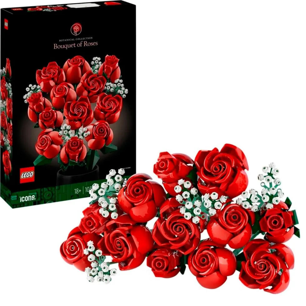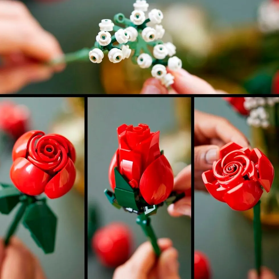 Het LEGO Botanical Collection 10328 Rozenboeket is een plezier om te bouwen en bevat een dozijn rode rozen. De rozen hebben verschillende bloeistadia, vier zijn in volle bloei, vier bijna in bloei en vier in knop. Ze hebben lange groene stelen om in een vaas te plaatsen, plus vier takjes gipskruid met kleine witte bloemetjes. Het boeket is eenvoudig in elkaar te zetten en vormt een elegante blikvanger in elke ruimte.