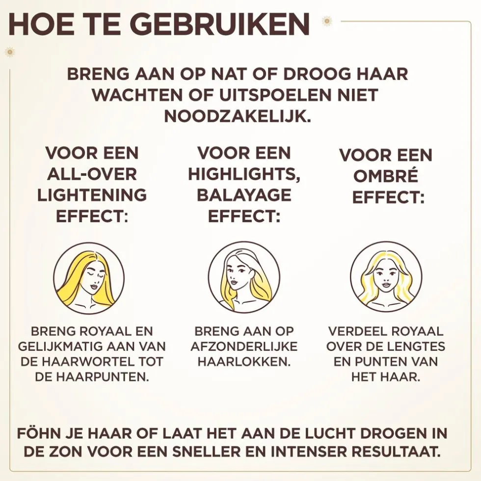 Voor een all-over lightening effect: Breng royaal en gelijkmatig aan van de haarwortel tot de haarpunten en borstel het haar door voor een gelijke verdeling.