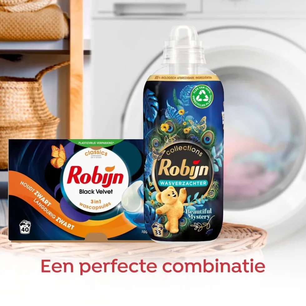 Robijn Black Velvet 3-In-1 Wasmiddelcapsules met Black Serum, wassen je zwarte was stralend schoon en houden je kleding lang mooi met de heerlijke geur van Robijn.