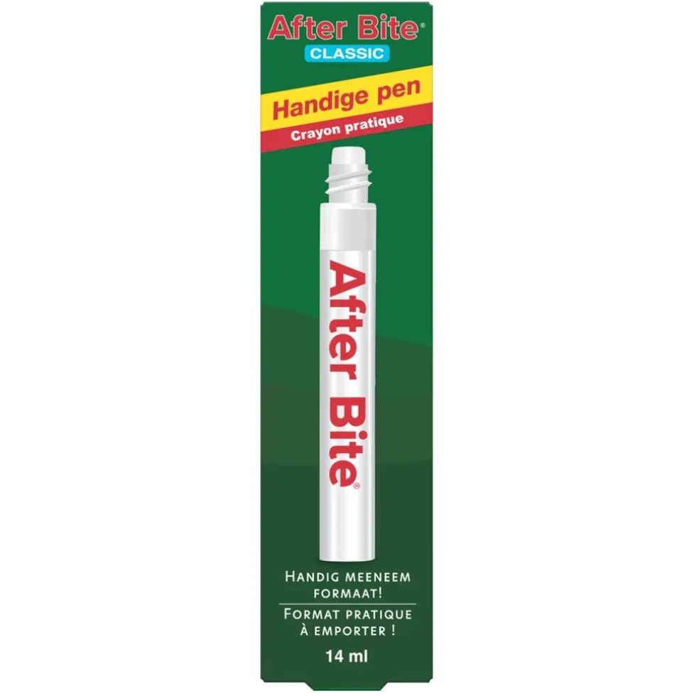 After Bite Classic is vloeibaar en verkrijgbaar in een handige penvorm, zodat je het gemakkelijk aanbrengt en je de vloeistof niet aan je vingers krijgt.