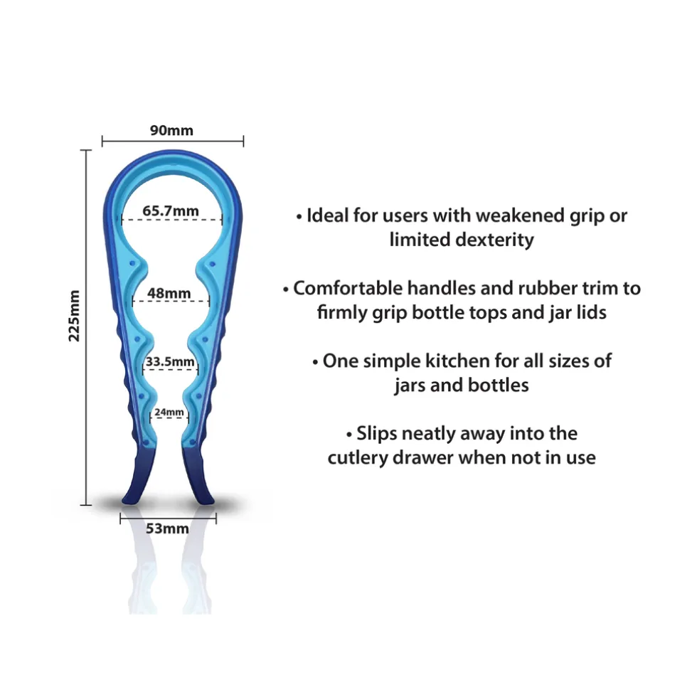 Dit gebruiksvriendelijke keukenhulpje is slim ontworpen om u in staat te stellen hardnekkige deksels van een grote verscheidenheid aan potten en flessen snel te openen met slechts één compact product. Hij is ideaal voor gebruikers met een verzwakte greep of beperkte handvaardigheid. De flexibele Universele Potten- en Flessenopener heeft een gevormde rubberen rand langs de binnenranden voor een stevige grip op het deksel, en een comfortabele gegroefde buitenrand zodat u gemakkelijker kunt vasthouden, knijpen en draaien. Met vier cirkelvormige secties van verschillende grootte om de kleinste tot de grootste deksels aan te kunnen!