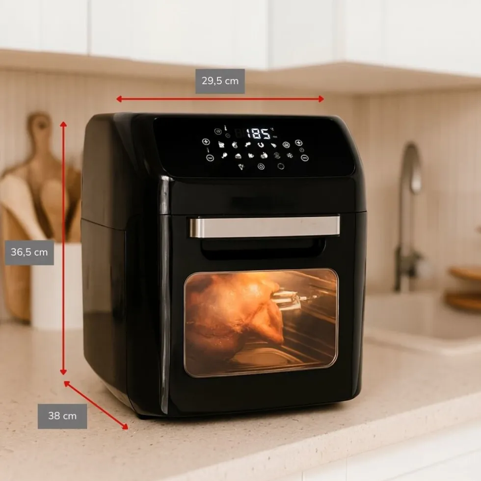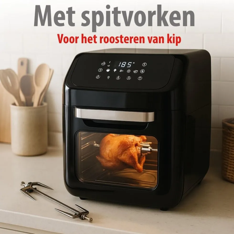 Deze hetelucht oven en hetelucht friteuse, ook wel airfryer genoemd, heeft een inhoud van maar liefst 12 liter. Dat betekent dat je er zelfs een hele kip in kunt grillen. Frituren, bakken of grillen met deze vrijstaande oven van het merk alpina is een stuk gezonder omdat je minder vet of olie hoeft te gebruiken.Lekker knapperigIn plaats van met olie of vet worden je gerechten met hete lucht goudbruin gebakken of gefrituurd. Je frietjes, kip of andere snacks en gerechten worden lekker knapperig en smaken net zo lekker als uit een reguliere friteuse. Deze airfryer heeft een vermogen van 1800 Watt. Hij is voorzien van digitale tijd- en temperatuurregeling. Door de verlichting in de oven zie je altijd hoe ver je gerecht is.Met digitaal schermDe hetelucht oven ziet er mooi zwart glanzend uit. De tiptoetsen en digitaal schermpje zitten bovenop. Je ziet in een oogopslag hoe je verschillende ingrediënten moet klaarmaken. Dat regel je via de keuzetoetsen. Je kunt met deze oven bakken, frituren en grillen aan het spit, maar ook drogen op lage temperaturen. Dit doe je bijvoorbeeld met fruit.Praktische accessoiresDe oven opent met een klep en je krijgt er heel wat praktische accessoires bij. Een rotisserie spit waar je een kip of een rollade aan kunt roosteren. 2 spitvorken en 1 verwijderhulp om de kip of het vlees in een beweging uit de oven te halen. Verder krijg je 2 bakroosters waarop je frietjes en snacks kunt garen en een opvangbak voor druipend vet.Specificaties alpina hetelucht oven/ airfryer