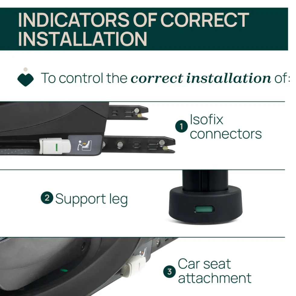 De installatie van de Isofix base is heel eenvoudig dankzij de visuele bevestigingsindicatoren. Zo weet je zeker dat alles goed en veilig vast zit.