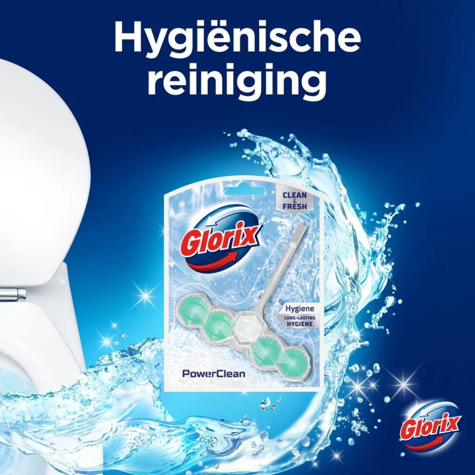 Het Glorix Hygiëne Toiletblok geeft elke spoelbeurt de kracht van Glorix Power 5, tot wel 300 spoelbeurten lang.