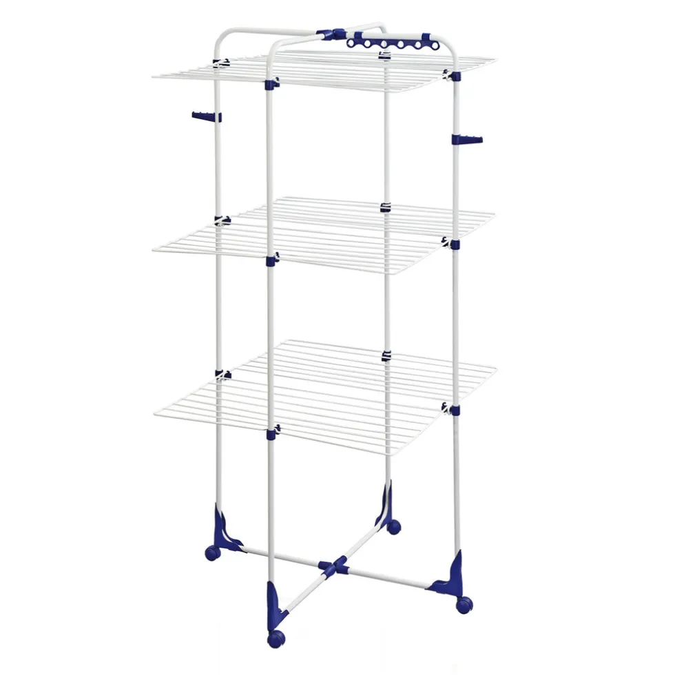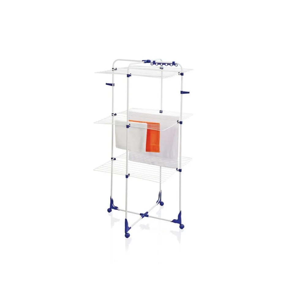 Dankzij de vier geïntegreerde, soepel lopende wieltjes kan het droogrek moeiteloos verplaatst worden, ook als het vol was hangt. De wieltjes zijn 360° draaibaar en daardoor erg wendbaar. De droogtoren is perfect voor gezinnen met kinderen en weinig plaats voor het drogen van de was. Na gebruik kan je de droogtoren compact in klappen en opbergen. Dankzij de 2 houders voor kledinghangers aan de zijkanten en de 6 extra openingen bovenop waar je kleerhangers in kunt haken, biedt de droogtoren nog meer ruimte voor je wasgoed. De hoogte is 1,46 meter.