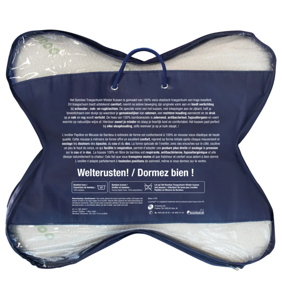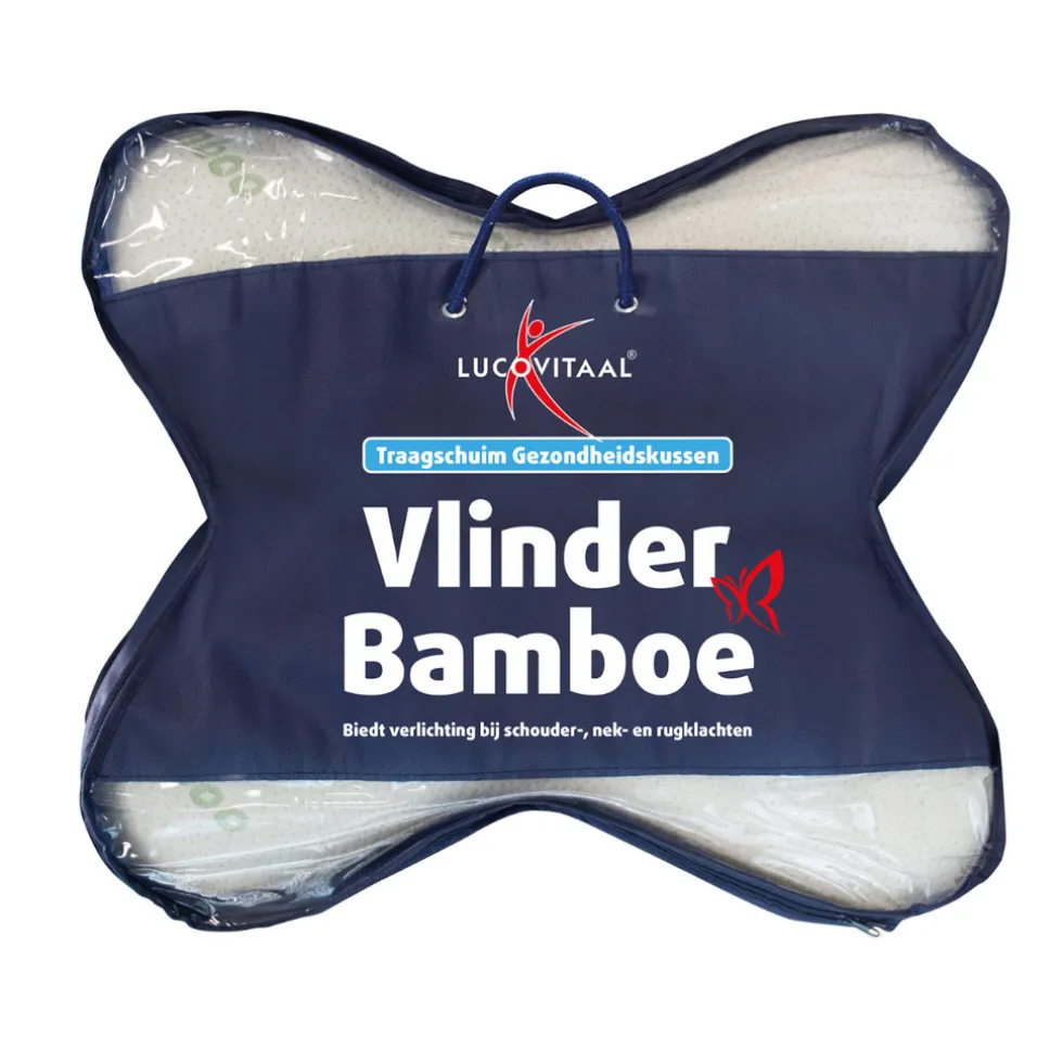 Het Bamboe Traagschuim Vlinder Kussen is gemaakt van 100% visco elastisch traagschuim van hoge kwaliteit. Dit traagschuim biedt uitstekend comfort, neemt na iedere beweging zijn originele vorm aan en biedt verlichting bij schouder-, nek- en rugklachten.