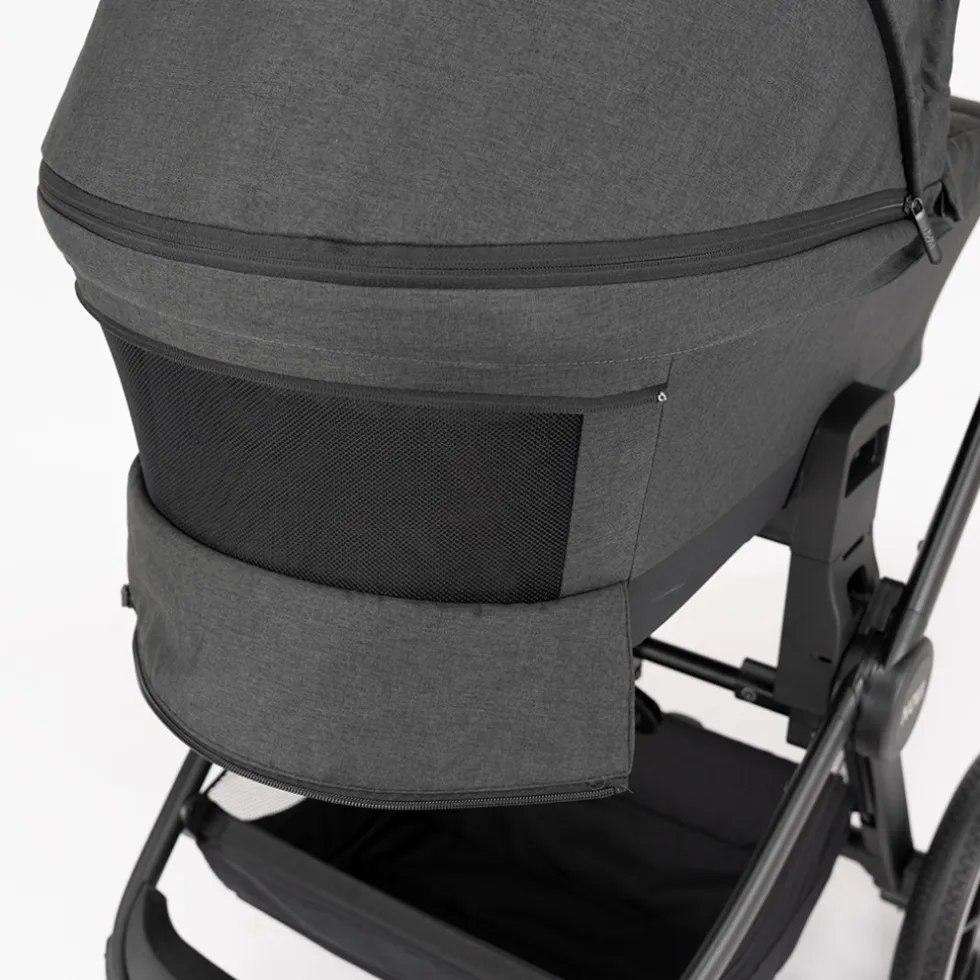 De reiswieg van de kinderwagen is voorzien van een stevige kuip met een gewatteerde binnezijde. De stiksels geven de bekleding een mooie look en het zachte matrasje zorgt voor goede comfort. In zowel de zonnekap als de kuip van de reiswieg zit extra ventilatie. Dit in combinatie met het afsluitbare dekje zorgt voor een optimaal klimaat voor je baby in de reiswieg.