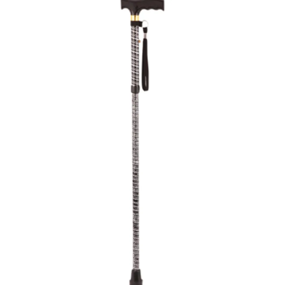 Uitschuifbare geplastificeerde wandelstok met gegraveerd patroon. Een uitschuifbare, geplastificeerde wandelstok met 5 opvouwbare secties en in 5 hoogtes verstelbaar, voor links en rechtshandig gebruik. Dit model beschikt over een aantrekkelijke, decoratief gegraveerd patroon in zilverkleur en is verkrijgbaar in verschillende kleuren en designs. De opvouwbare wandelstok kan eenvoudig opgeborgen in een tas, zak of lade voor opslag of reizen. Het is gemaakt van stevig, lichtgewicht aluminium met een ergonomisch ontworpen plastic handvat en een zachte, duurzame rubberen tip voor veiligheid en comfort. riem voor opslag.