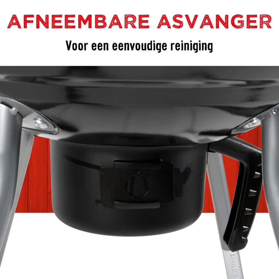 Hou je ervan om te barbecueën? Met deze kogelbarbecue van BBQ collection bereid je je vlees, vis en groente op houtskool, wat je gerechten de typerende barbecuesmaak geeft.Directe en indirecte warmteEen kogelbarbecue kenmerkt zich door de bolle vorm waar hij zijn naam aan ontleent. Het is niet alleen een schaal met een rooster, maar ook een deksel. Daardoor krijg je veel meer mogelijkheden om je favoriete barbecuegerechten te bereiden. Met het afsluitbare deksel kan je barbecue namelijk een ovenfunctie vervullen en gebruik je directe en indirecte warmte. Met het RVS luchtrooster kun je bovendien de hoeveelheid zuurstof regelen en daarmee de temperatuur in de BBQ. Het deksel heeft een groot handvat om hem gemakkelijk te liften. Aan de binnenkant zit een haak waarmee je het deksel kan ophangen als je hem even niet gebruikt.Met verchroomd roosterHet grillrooster van deze barbecue heeft een diameter van 45 cm; voor veel mensen een prima formaat. Wil je wat spullen binnen handbereik houden? Leg ze dan onder de barbecue op het verchroomde rooster. De BBQ heeft een hoogte van zo’n 83 cm, zodat je staand kunt barbecueën zonder ver voorover te hoeven buigen. Fijn voor je rug!