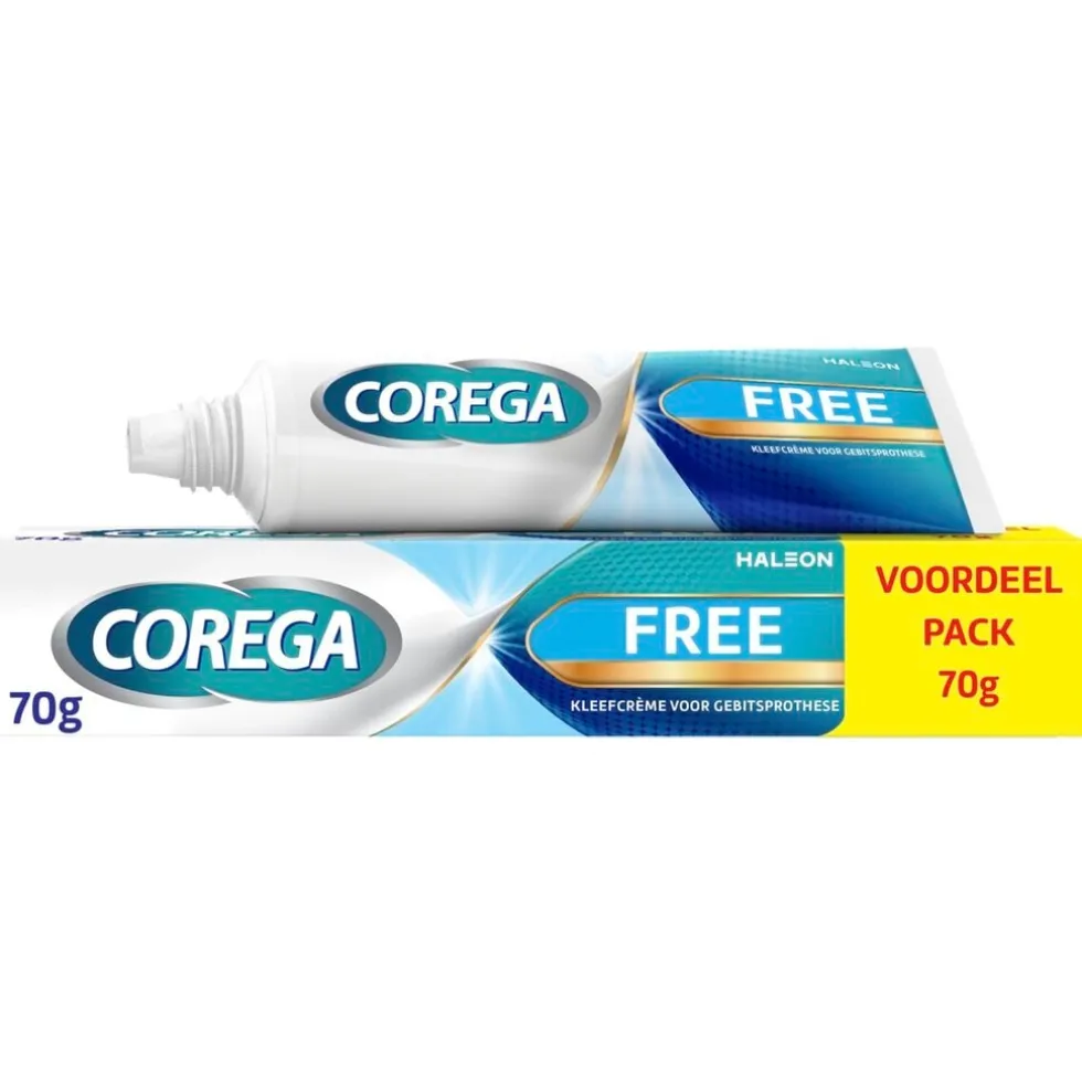 Corega Free is vrij van zink en artificiële kleuren. Een kleefmiddel gebruiken geeft je de houdkracht die je nodig hebt en geeft je de hele dag lang een zorgeloos gevoel, zonder dat het invloed heeft op de smaak van je voedsel.