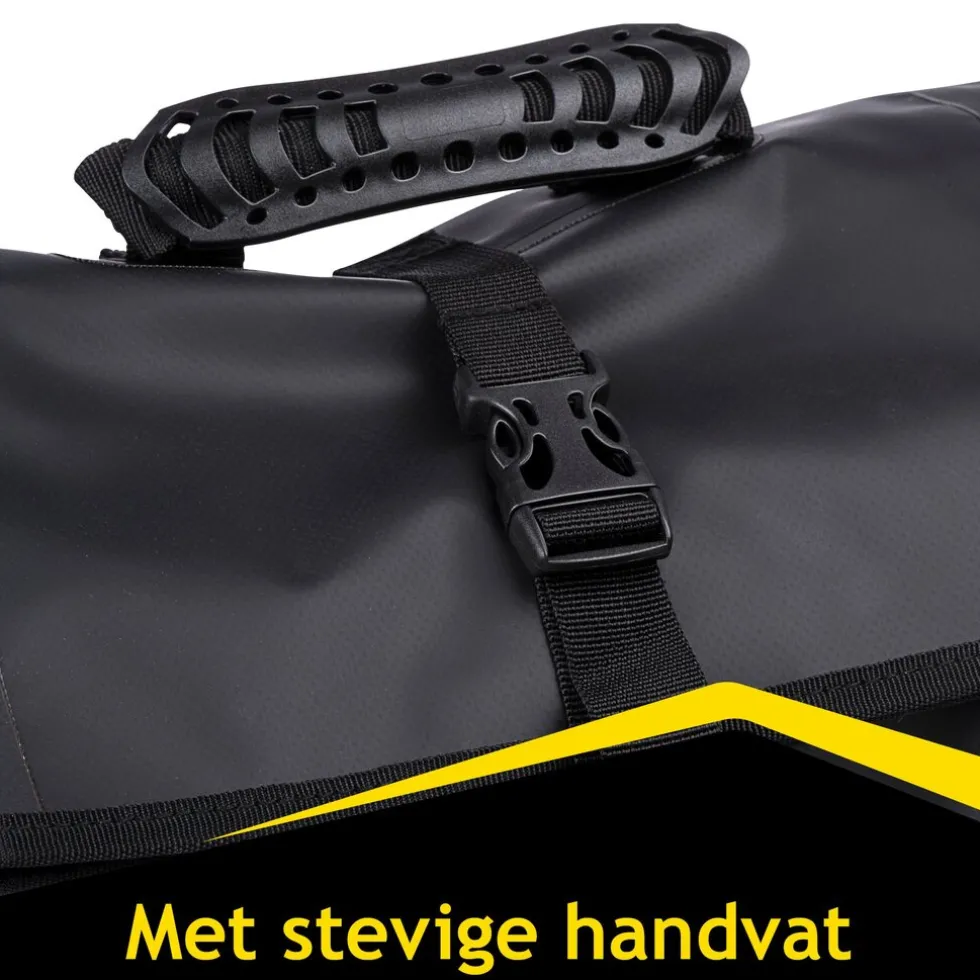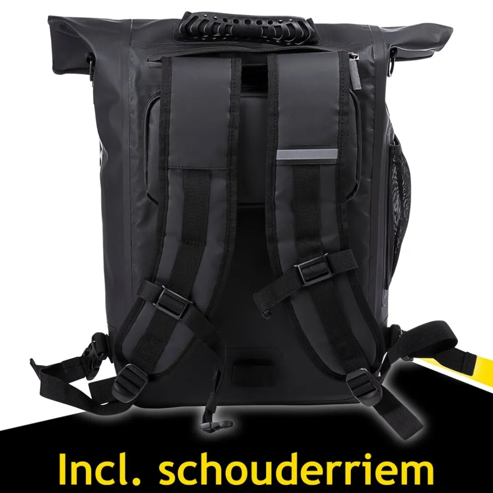 De fietsrugzak beschikt over twee stevige schouderbanden zodat je hem comfortabel als rugzak draagt. Door de meegeleverde tasriem met haken hang je het met hetzelfde gemak over je schouder en aan de bovenkant van de tas zit een handvat. Aan de achterkant van de fietsrugtas vind je twee kunststof klemhaken waarmee je de fietsrugtas aan je bagagedrager kunt vastmaken.
