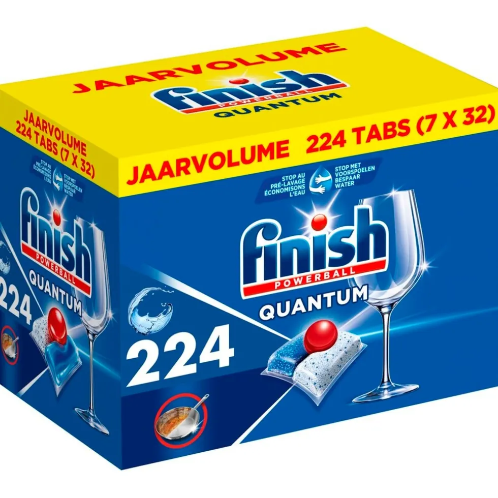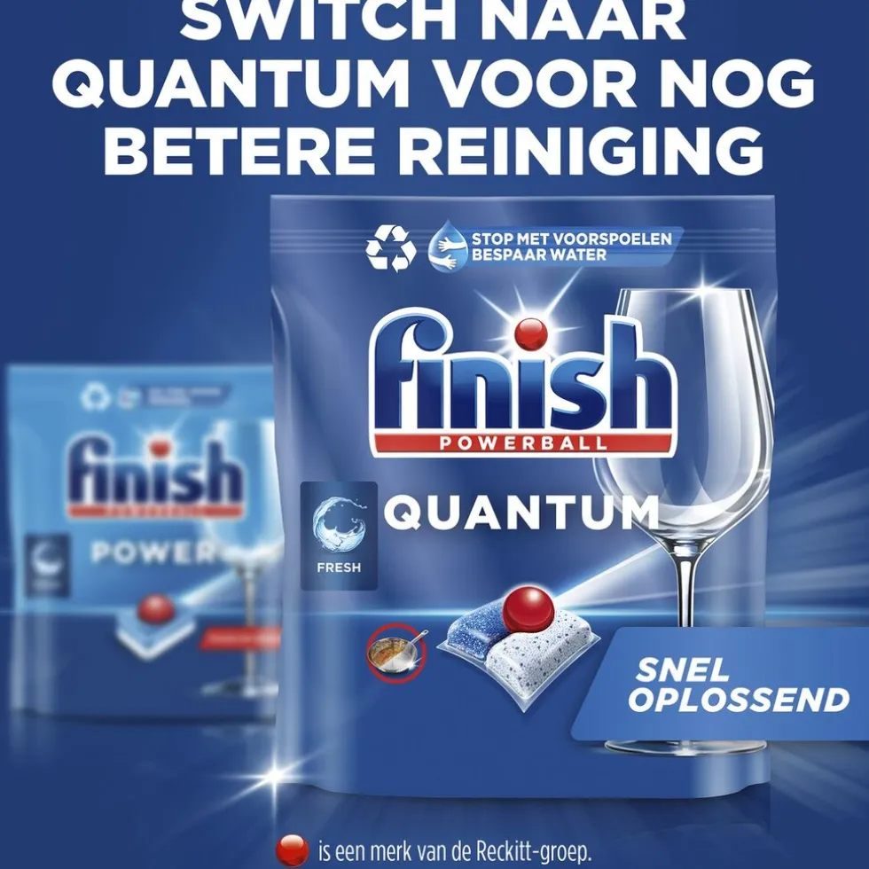 De Finish Powerball Quantum All-in-1 Vaatwascapsules bieden effectieve reiniging en glans en zijn effectief op vetvlekken. Voor een sprankelend schone vaat!