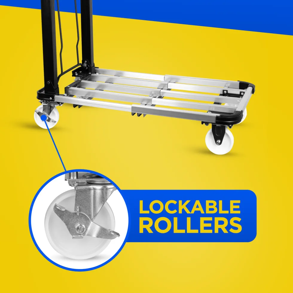 Inklappen maarDe kar heeft een duwbeugel met een softgrip handvat. De afmetingen van de trolley zijn 71 x 41 x 94,5 cmcentimeter. Gebruik je de transportwagen niet dan klap je hem in zodat je hem compact kunt opbergen. Je kunt de duwbeugel inklappen en het platform in elkaar schuiven zodat hij nog minder plaats inneemt.Het karretje meet opgevouwen56 x 41 x 23 cm.