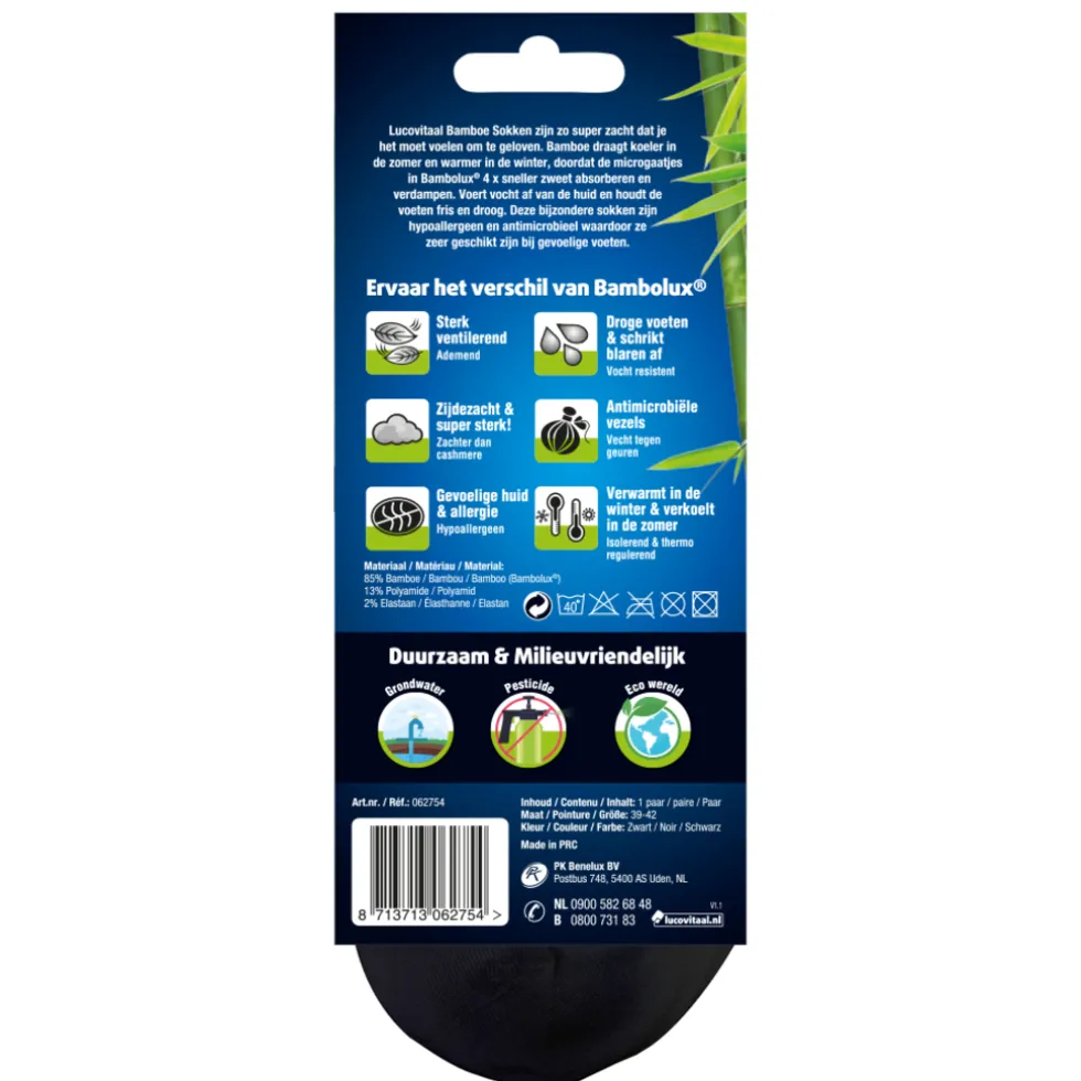 Lucovitaal Bamboe Sokken zijn zo super zacht dat je het moet voelen om te geloven. Bamboe draagt koeler in de zomer en warmer in de winter, doordat de microgaatjes in Bambolux® 4 x sneller zweet absorberen en verdampen. Voert vocht af van de huid en houdt de voeten fris en droog.