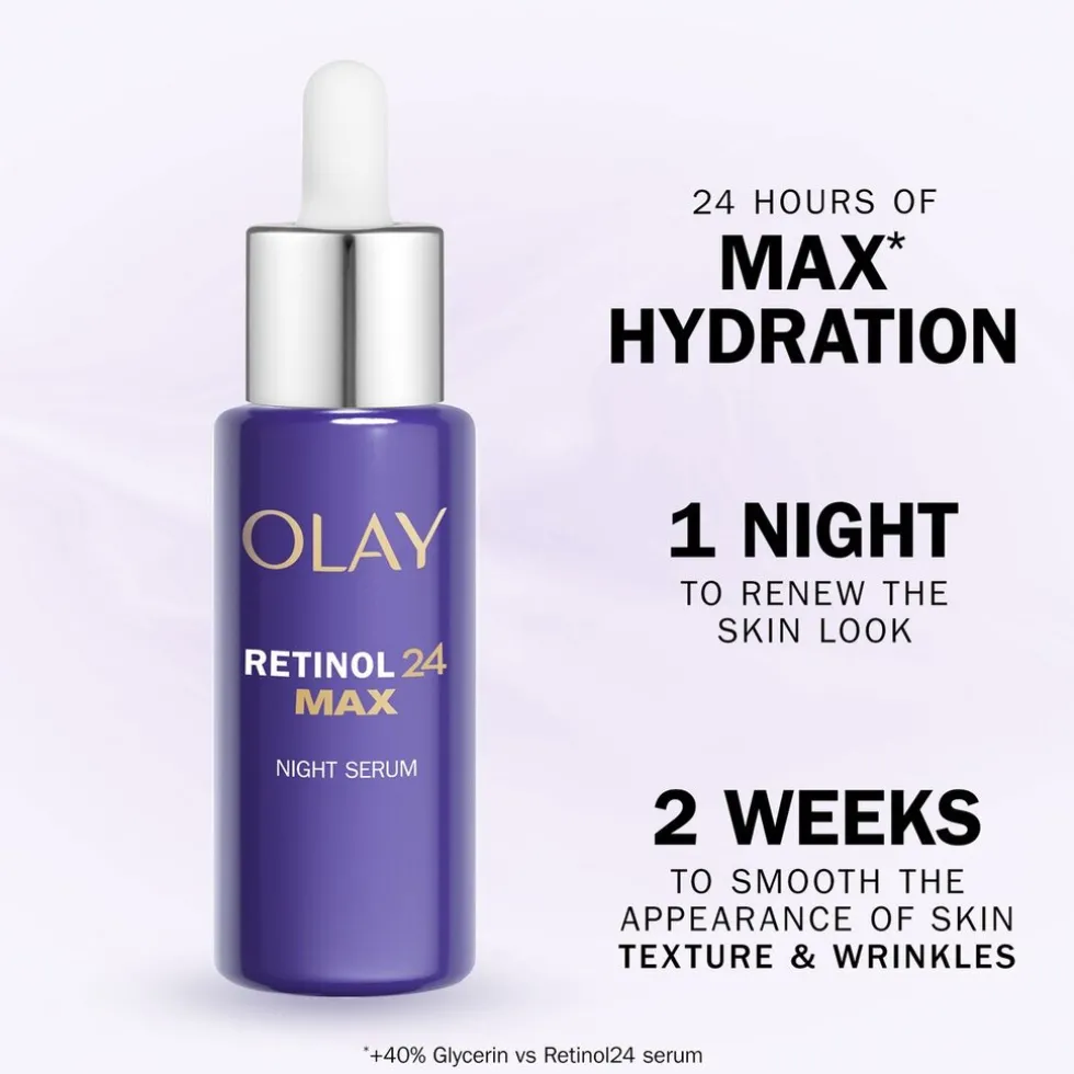Vernieuw je huid met het Olay Retinol24 MAX Nachtserum Het serum levert transformerende huidresultaten en heeft een drievoudige werking: maakt je huid glad, vernieuwt en hydrateert.