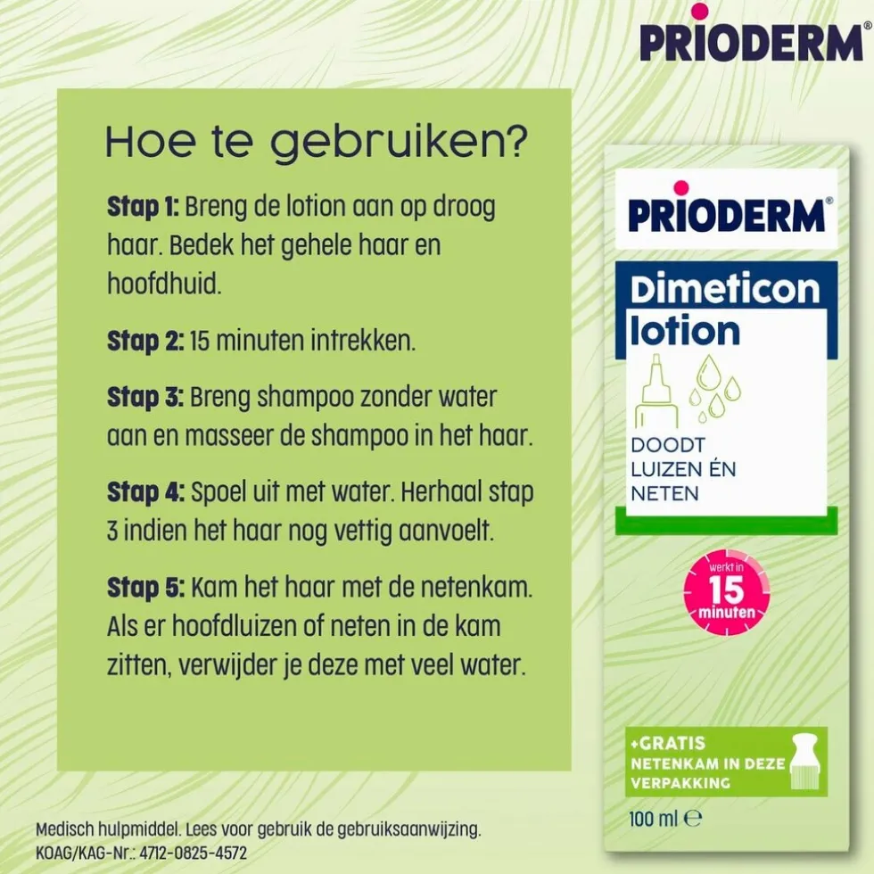 Prioderm Dimeticon Anti-Luislotion doodt hoofdluizen en neten in 15 minuten en is geur- en kleurloos. In de verpakking van de lotion is een metalen netenkam bijgesloten.