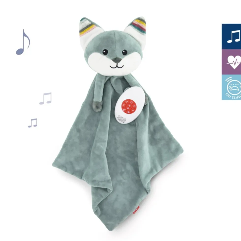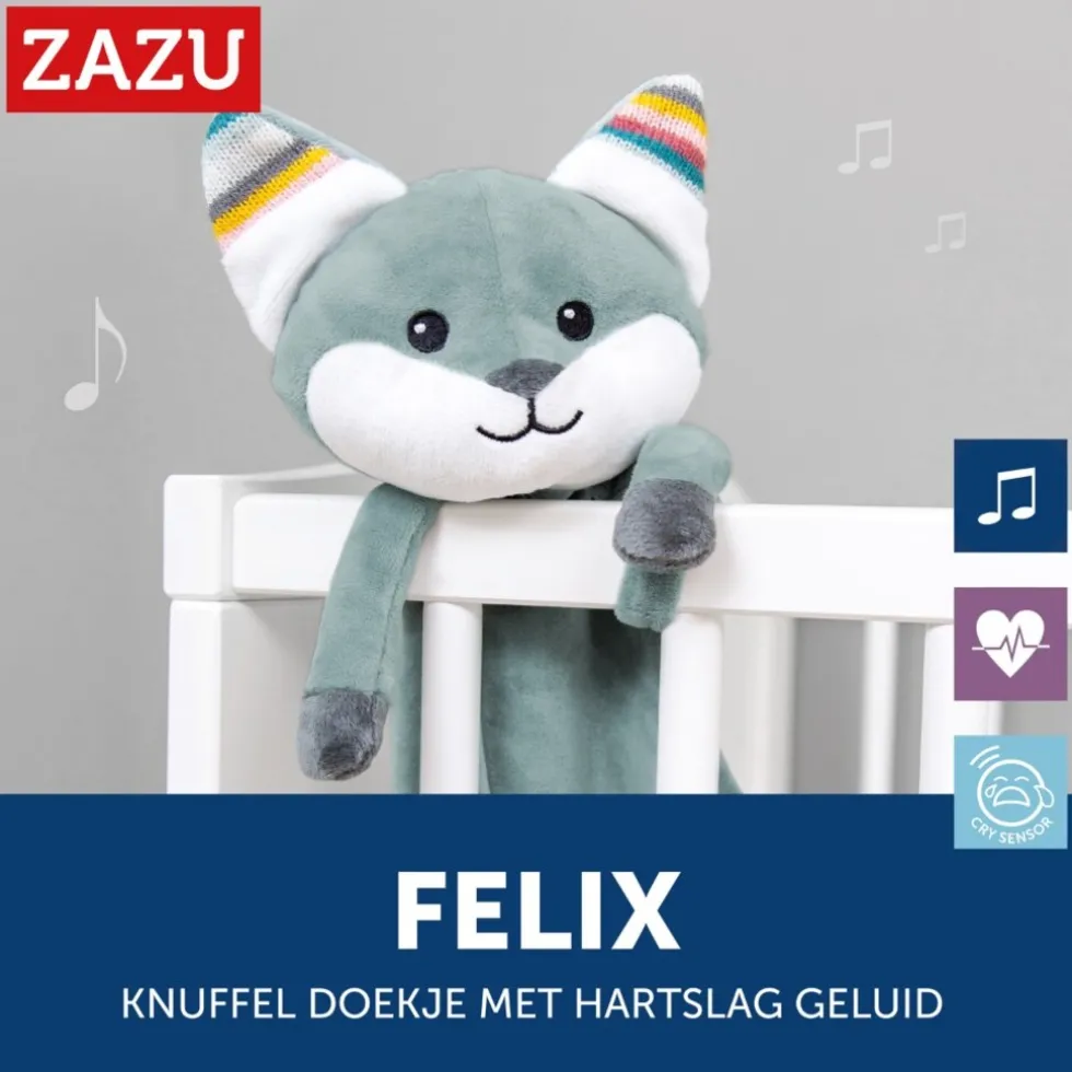 Felix speelt 6 verschillende geluiden af met de keuze uit een hartslag, natuurgeluid, white noise en 3 fijne slaapmelodietjes. Na 10 minuten schakelt de muziek automatisch uit. Als je kleine huilt, zorgt de huilsensor ervoor dat het laatst gekozen nummer weer wordt afgespeeld. Het knuffeldoekje komt met een module waarmee je de geluiden kunt kiezen en het geluidsvolume kunt regelen. De module kun je na het gekozen geluid in het hoofdje van het doekje plaatsen.