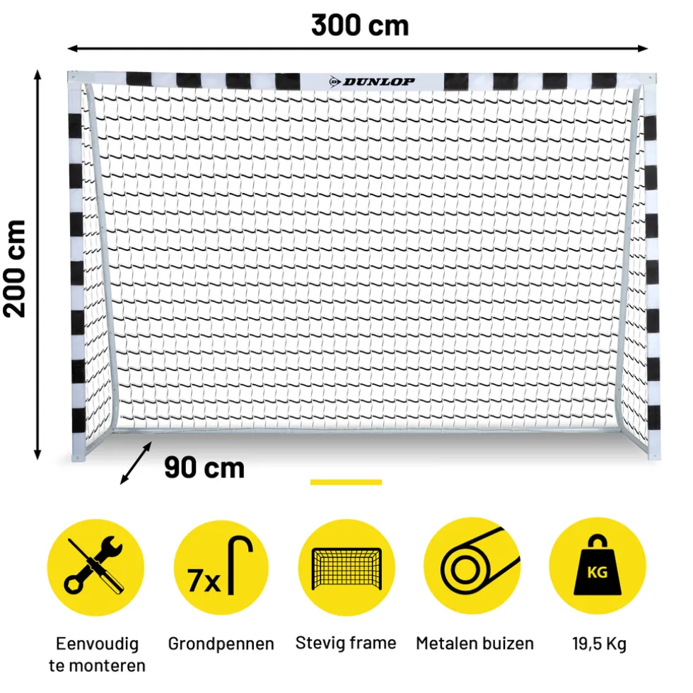 Voetballen in de eigen achtertuin was nog nooit zo makkelijk als met dit stevige voetbaldoel van Dunlop. Het zwart/witte frame is gemaakt van stevig metaal dat middels een klik-systeem makkelijk en snel in elkaar gezet kan worden. Voor extra stevigheid worden er 7 grondhaken meegeleverd met het voetbaldoel. Hierdoor staat hij stevig in de grond en valt de goal minder snel om. Dankzij de afmetingen van de goal, 300 bij 90 bij 200 centimeter, is deze geschikt voor voetballers van verschillende leeftijden. Zo kun je jouw vrienden, familieleden, ouders of zelfs de buren uitdagen voor een spannend potje voetbal.