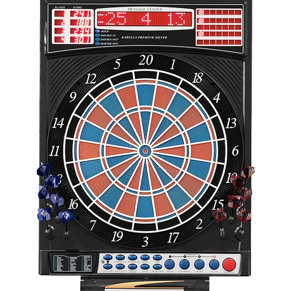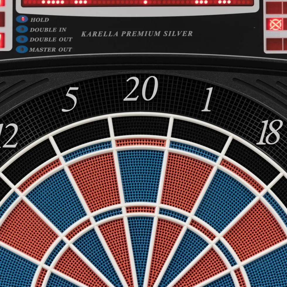 State-of-the-art electronisch dartboard voor competitie gebruik. Hoge kwaliteit van gebruikte materialen en grote hoeveelheid aan spelmogelijkheden. De computergestuurde speaker geeft de scores weer gecombineerd met spectaculaire geluidseffecten die het speelplezier verhogen. Met de Karella Premium silver speel je op topniveau! Specificaties: