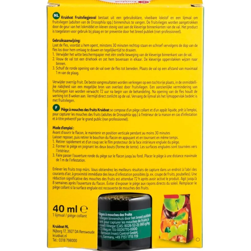 De Kruidvat Fruitvliegjesval bestaat uit een gebruiksklare, vloeibare lokstof en een lijmval om fruitvliegen (adulten van de Drosophila spp.) binnenshuis te vangen.