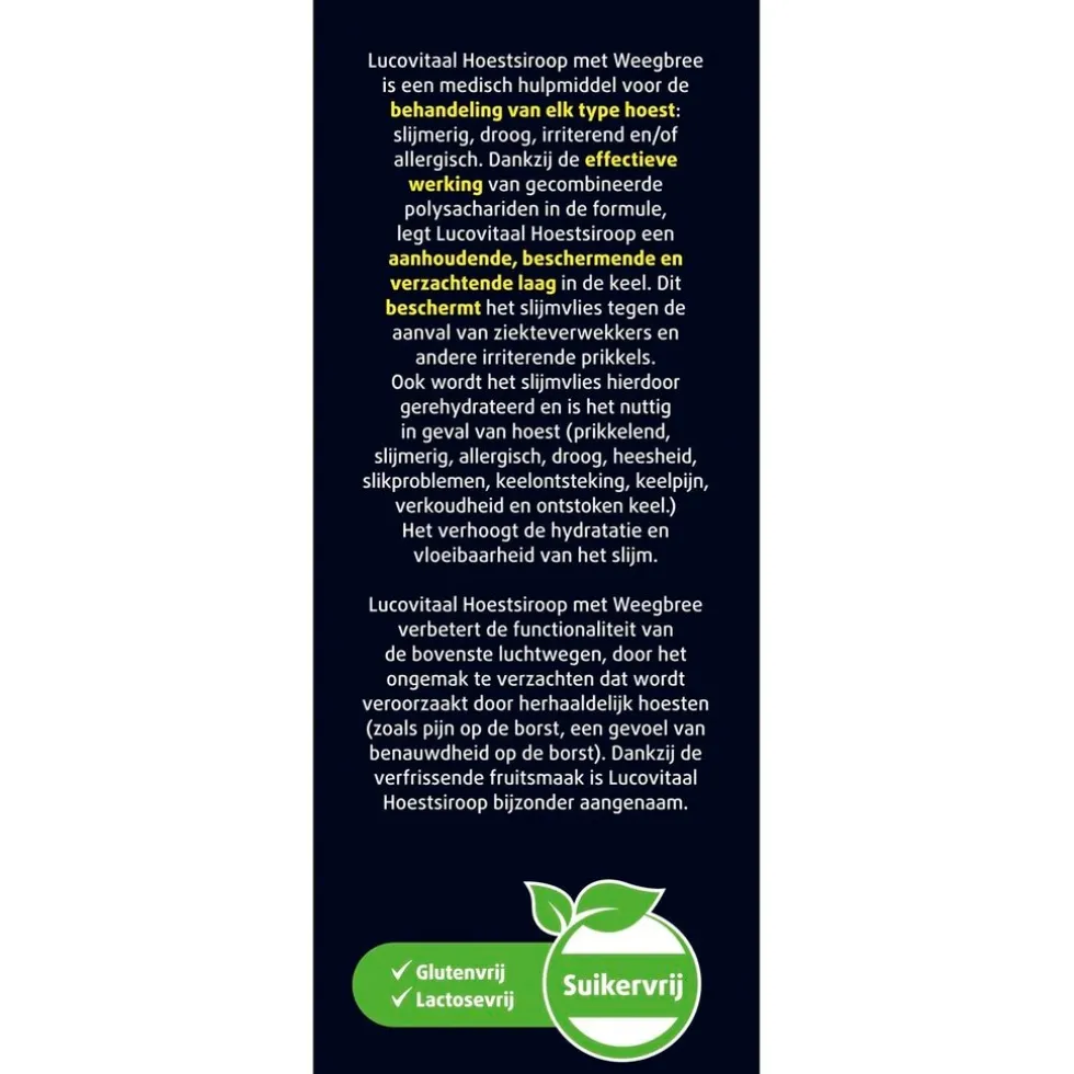 Lucovitaal 3-in-1 Hoestsiroop met weegbree is een medisch hulpmiddel voor de behandeling van elk type hoest: slijmerig, droog, irriterend en/of allergisch.