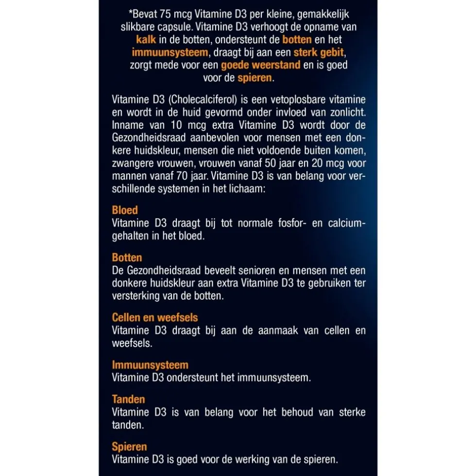Vitamine D3 verhoogt de opname van kalk inde botten, ondersteunt de botten en hetimmuunsysteem, draagt bij aan een sterkgebit, zorgt mede voor een goede weerstanden is goed voor de spieren. Vitamine D3draagt bij tot normale fosfor- encalciumgehalten in het bloed. Vitamine D3draagt bij aan de aanmaak van vellen enweefsel.;Claimbeschrijving|Geen suikers toegevoegd. Bevat geen zout.