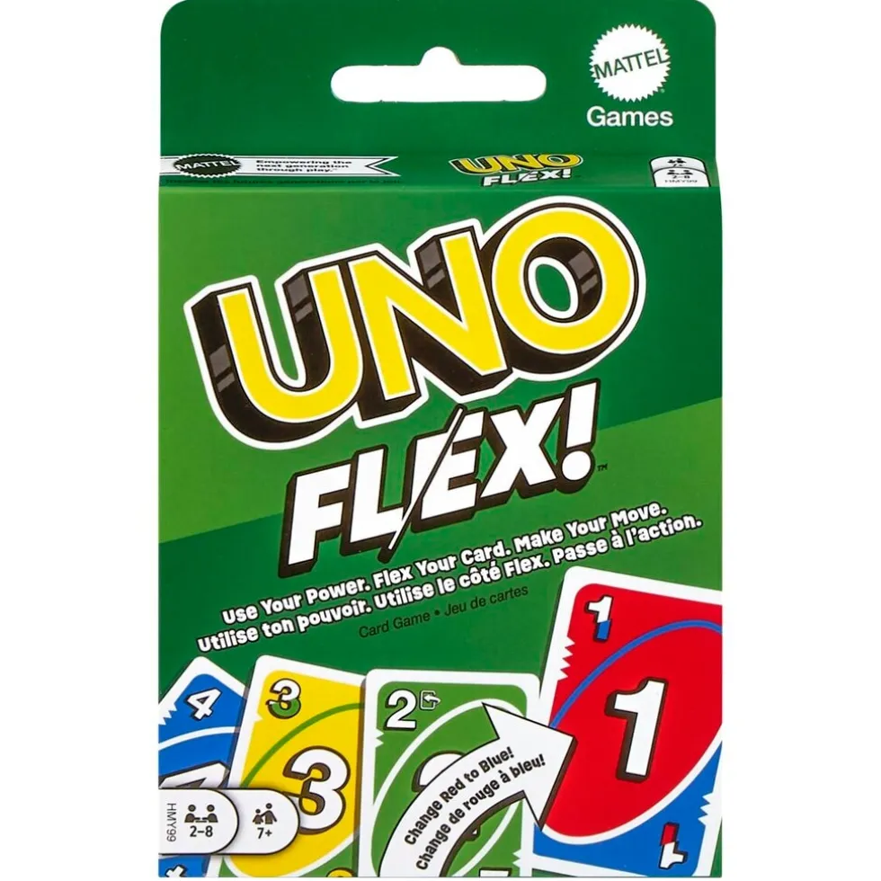 Mattel Uno Flex is gebaseerd op het spel Uno, maar met een flexibele instelling. Met speciale kaarten verander je een kaartkleur en maak je een match. Een rode vier wordt in één keer een groene vier.