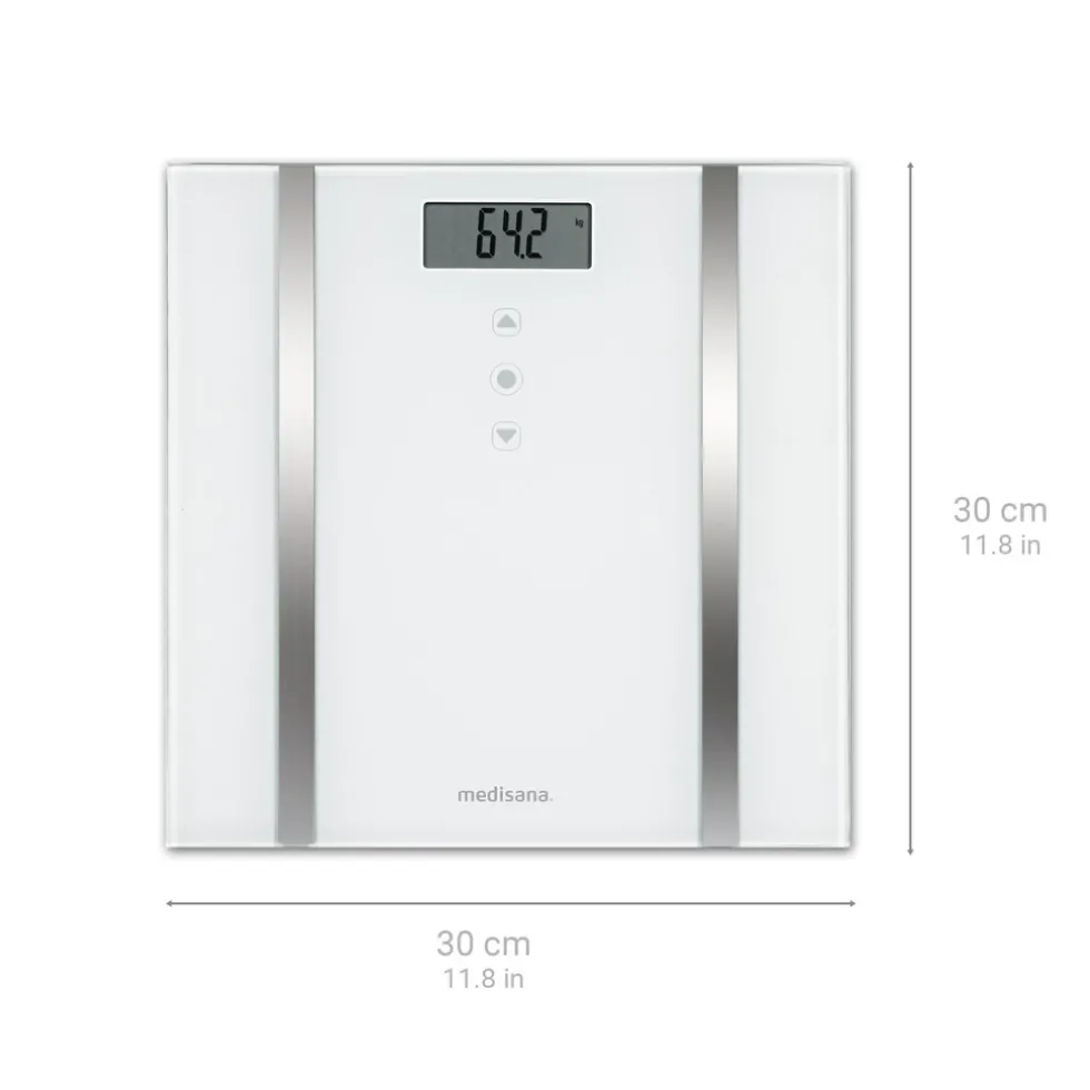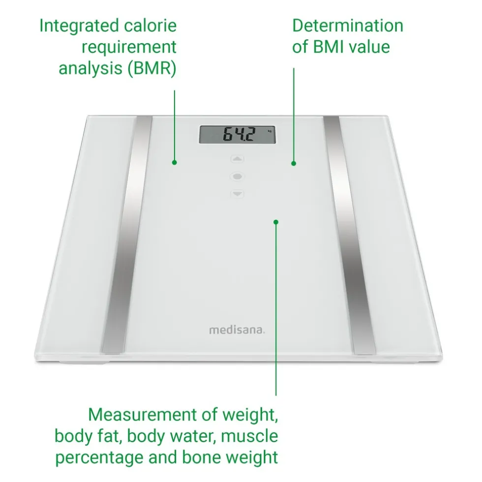 De BS 483 behoort tot de nieuwste generatie lichaamsanalyse weegschalen van MEDISANA en bevat dan ook de nieuwste technische snufjes die Medisana door jaren aan ervaring heeft ontwikkeld. De geborsteld RVS-elektroden meten met uiterste precisie de elektrische weerstand door de beide voeten en stellen zo zeer nauwkeurig het vet- en vochtpercentage vast en berekenen de spier- en botmassa. Deze functies helpen niet alleen bij het afvallen of op gewicht blijven, maar zijn de perfecte stimulans om de progressie van een work-out-schema te monitoren. Of je met dat gewicht op het juiste niveau zit in verhouding tot de lengte, laat de BMI-berekening dan weer zien. De berekening van de caloriebehoefte (BMR) geeft je nóg meer informatie en zo zorgt de BS 483 voor een zéér compleet overzicht van de lichamelijke gesteldheid.