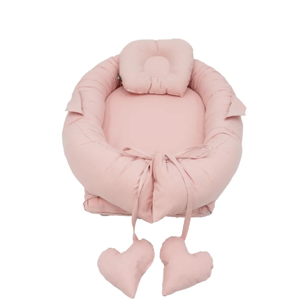 De hoes van het babynestje is gemaakt van 100% katoen wat hem lekker zacht maakt! Dankzij de schattige koordjes in de vorm van een hartje kun je de uiteinden van het babynestje makkelijk dicht binden. Daarnaast bevat het nestje een steunkussentje, dit biedt het hoofdje van je kindje ondersteuning. Mocht hij vies zijn geworden, dan kan je hem wassen op 30ºC.